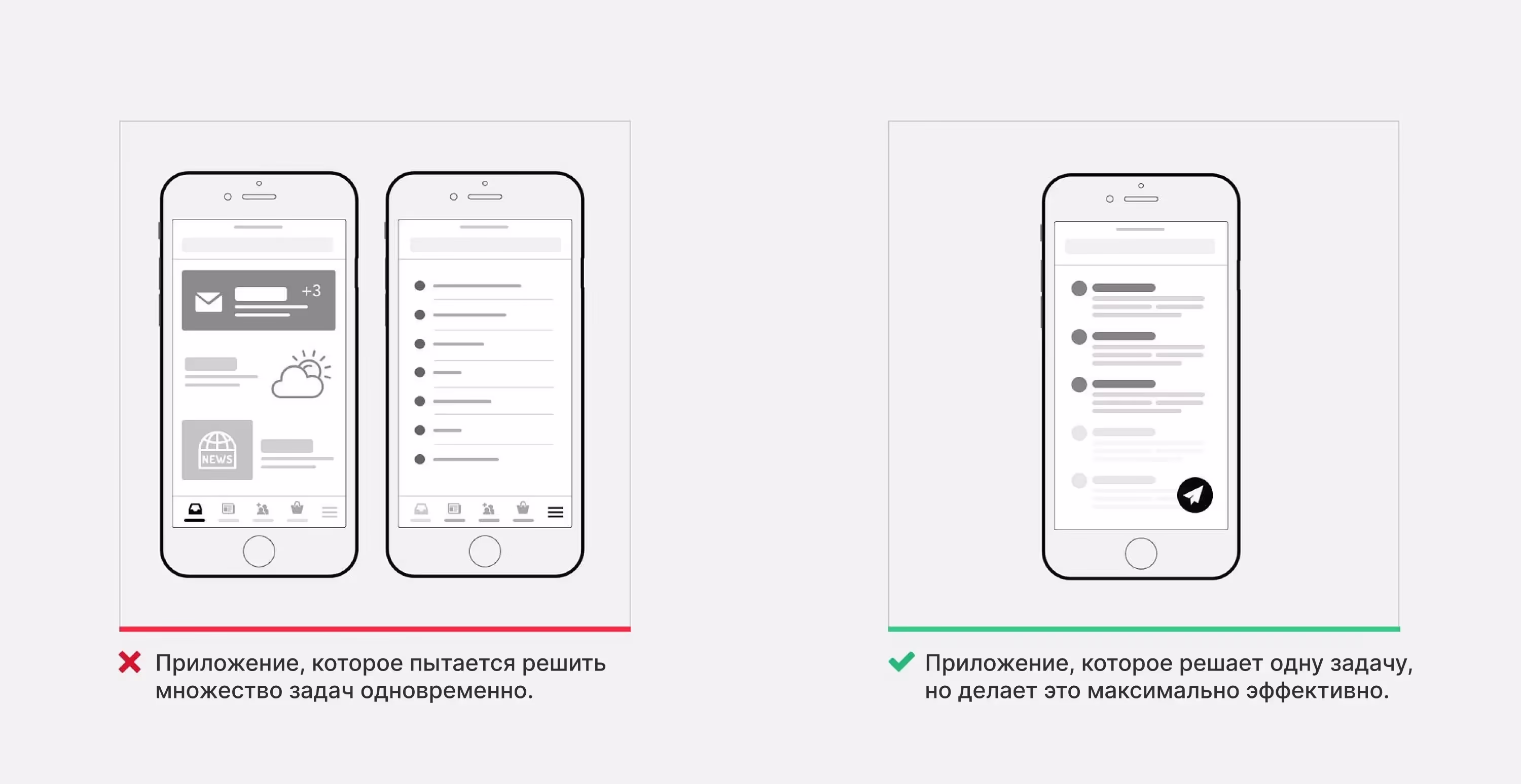 Существует множество цифровых продуктов, которые пытаются удовлетворить потребности всех и каждого. Этакие швейцарские ножи в мире дизайна. Если вы хотите, чтобы ваш продукт был простым, вам нужно четко определить ключевую ценность и целевую аудиторию. Не каждый продукт должен иметь встроенный Facebook*.