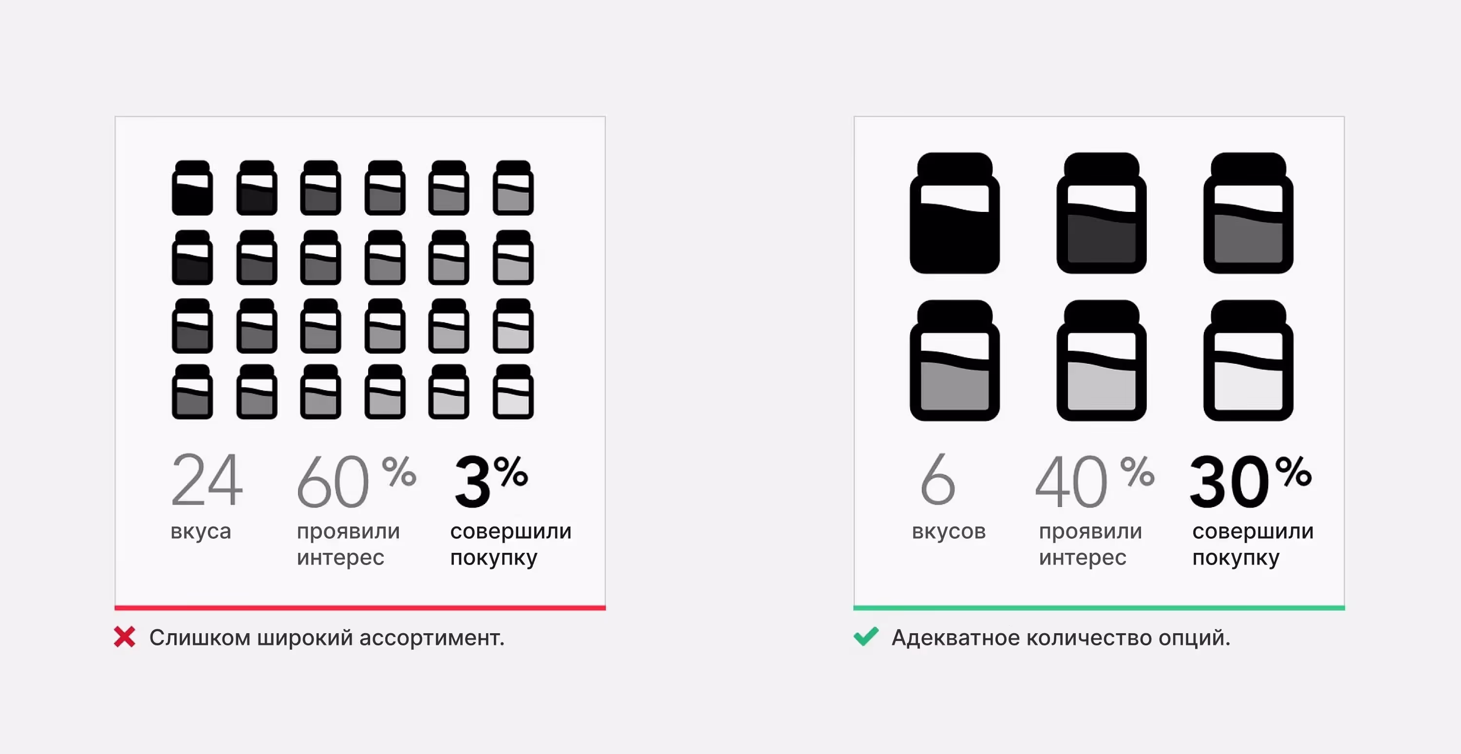 Многие думают, что чем больше выбор, тем лучше, но исследования доказывают обратное. Эксперимент с джемом — один из самых известных в потребительской психологии. Он показал, что обширный ассортимент действительно привлекает больше людей, но негативно сказывается на продажах. Таким образом, чтобы повысить продажи, необходимо ограничить количество доступных вариантов.