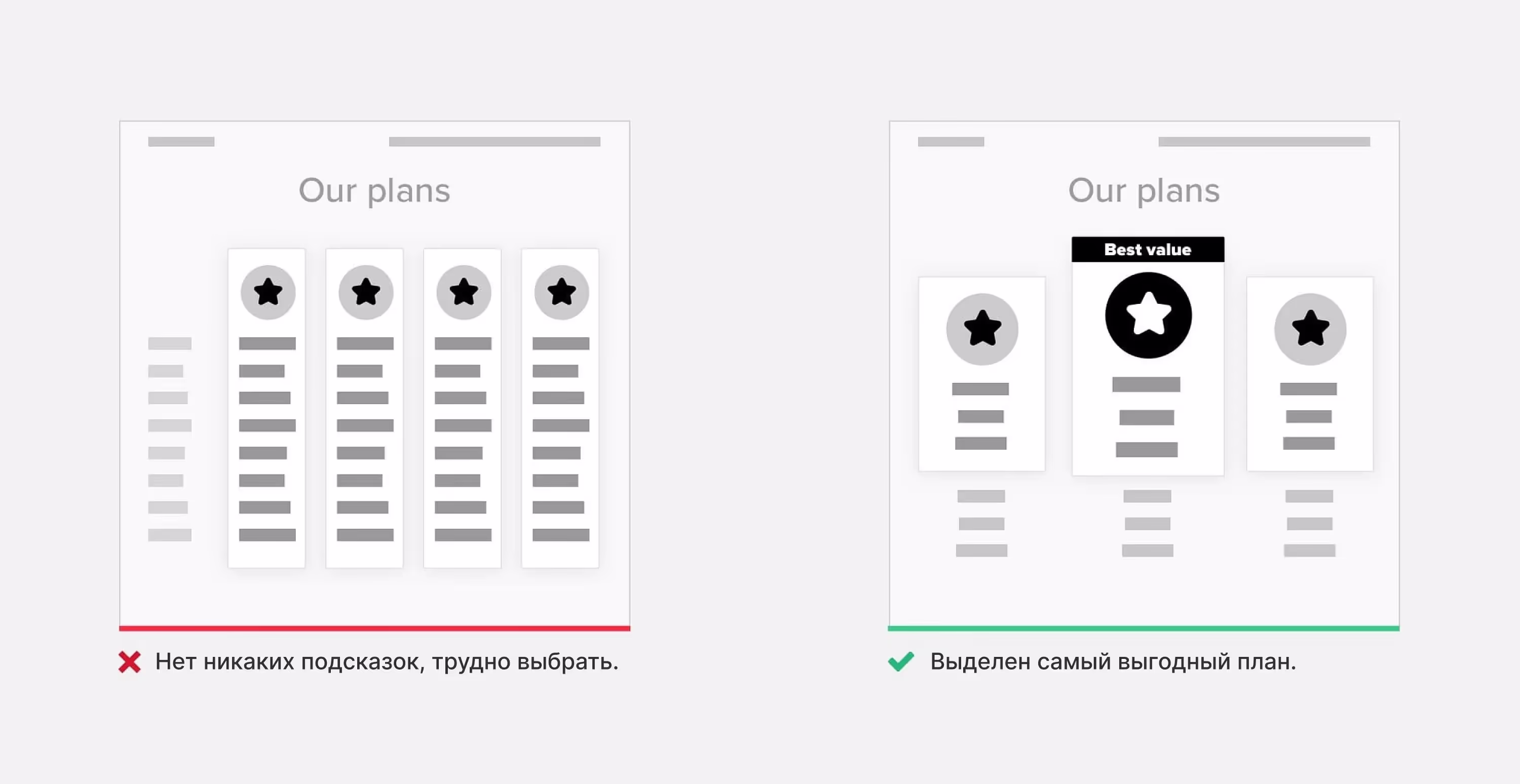 Если выбор неизбежен, упростите пользователям задачу. Дайте рекомендацию или покажите, что предпочитают другие покупатели. Четко объясните, чем отличаются предложенные варианты. Такой подход часто встречается на страницах с тарифными планами.