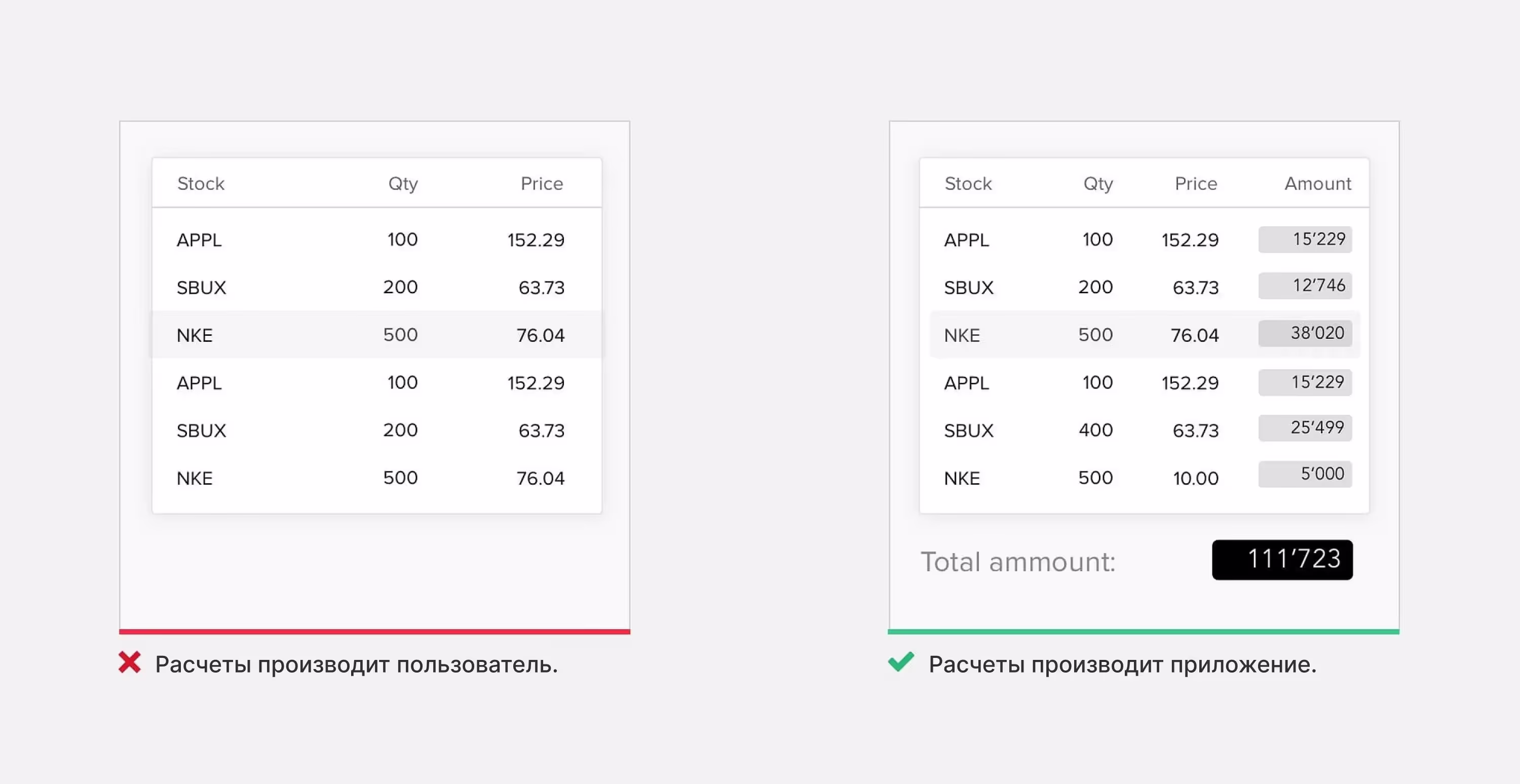 Среднестатистическому человеку трудно даются расчеты. Наш мозг эволюционно оптимизирован для распознавания объектов, а не для арифметических операций. Сделайте так, чтобы все вычисления выполняла система, а не пользователь.