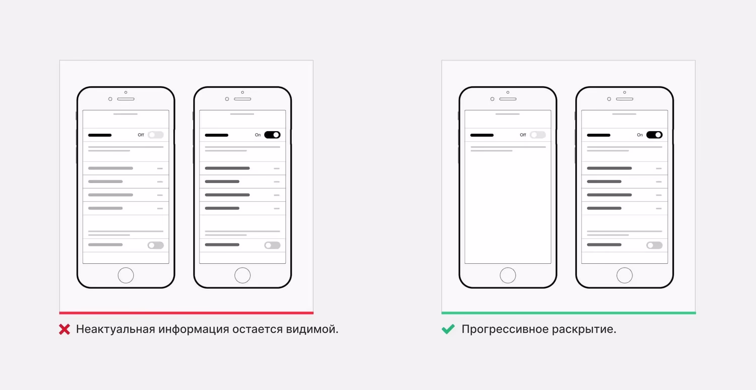 Прогрессивное раскрытие — шаблон проектирования, который позволяет сделать интерфейс более простым для восприятия. Это последовательное представление информации на нескольких экранах — «от абстрактного к конкретному». Такой дизайн не перегружает пользователя. Хороший пример — вложенная навигация iOS.