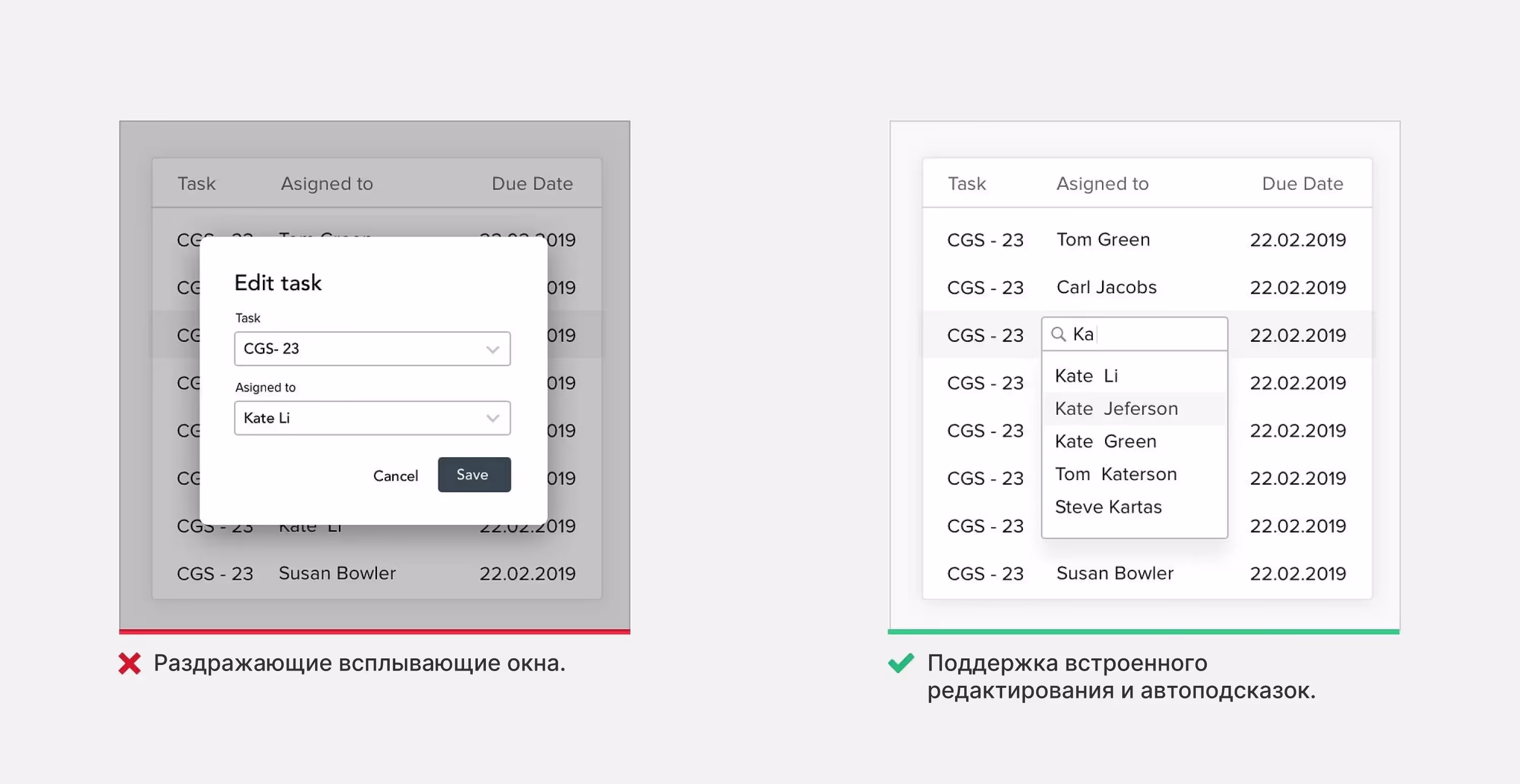 Удалите все лишние взаимодействия и шаги. Есть оптимальная скорость работы с системой, и она называется «состояние потока». Не нарушайте этот поток всплывающими окнами. Поддерживайте встроенное редактирование и автоматически подсказывайте подходящие значения.