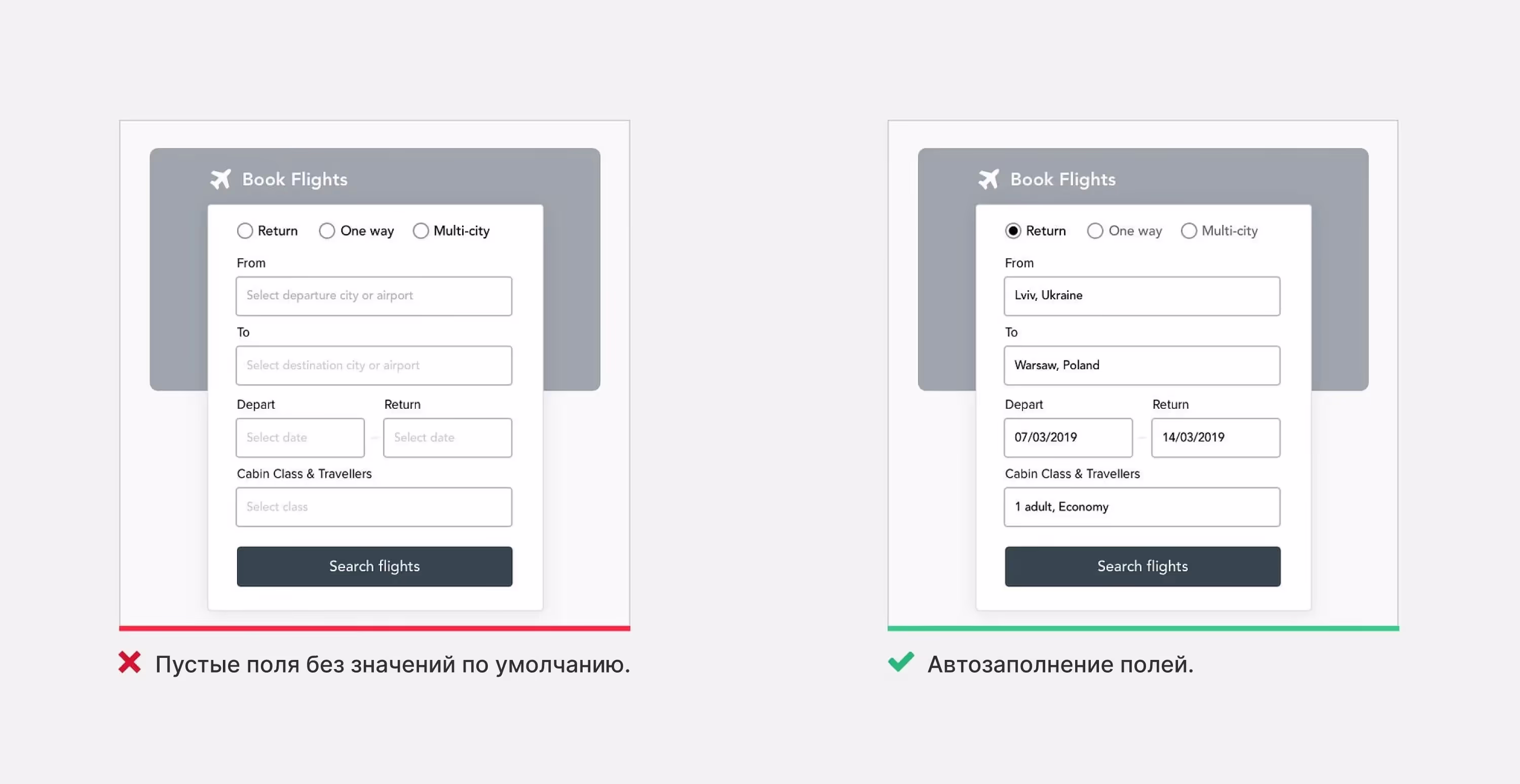 «Умные» значения по умолчанию — ответы, которые система предоставляет за пользователя автоматически. Они помогают быстрее заполнять формы. Определяя релевантные значения по умолчанию, мы должны понимать людей и контекст, в котором они будут использовать продукт. Для этого необходимы исследования и тесты. Всегда устанавливайте по умолчанию те значения, которые выбрало бы подавляющее большинство пользователей (90–95%).