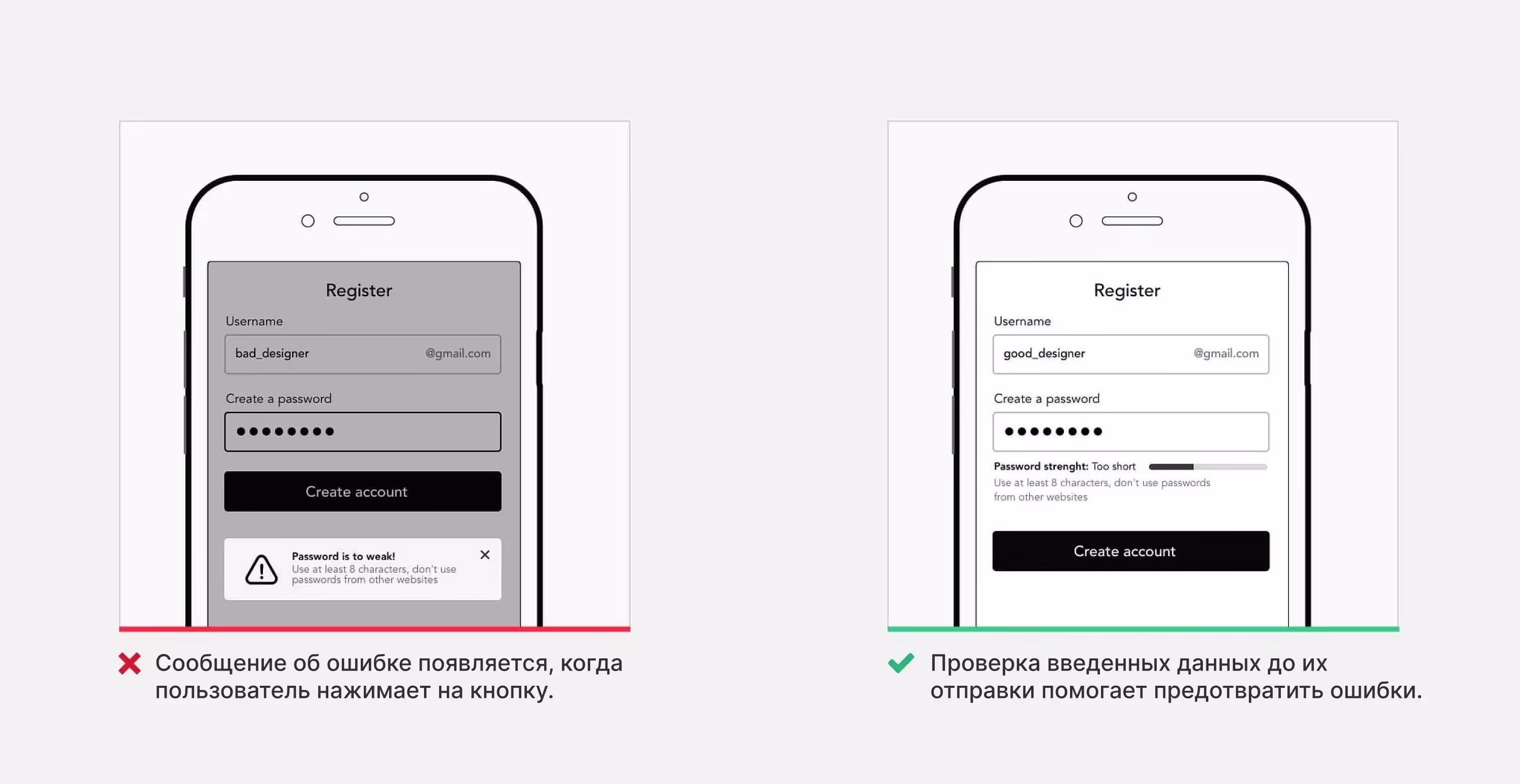 Сообщения об ошибках расстраивают пользователей, вызывая ощущение, что они не справились с задачей. Чтобы сократить количество ошибок, обеспечьте автоматическую проверку введенных данных и предупреждайте пользователей, если они вводят что-то неправильно.