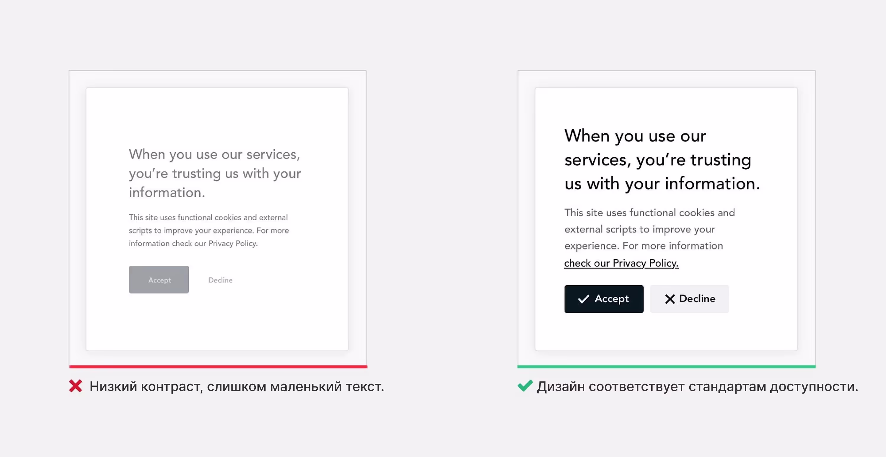 Задача дизайнера — сделать так, чтобы продукт был доступен широкой аудитории. Помните, что в мире насчитывается более 1 миллиарда людей с ограниченными возможностями. Не используйте цвет как единственное визуальное средство передачи информации. Обеспечьте достаточный контраст между текстом и фоном. Убедитесь, что с продуктом можно взаимодействовать при помощи клавиатуры и т. д. Когда вы заботитесь о доступности, вы улучшаете опыт всех пользователей без исключения.