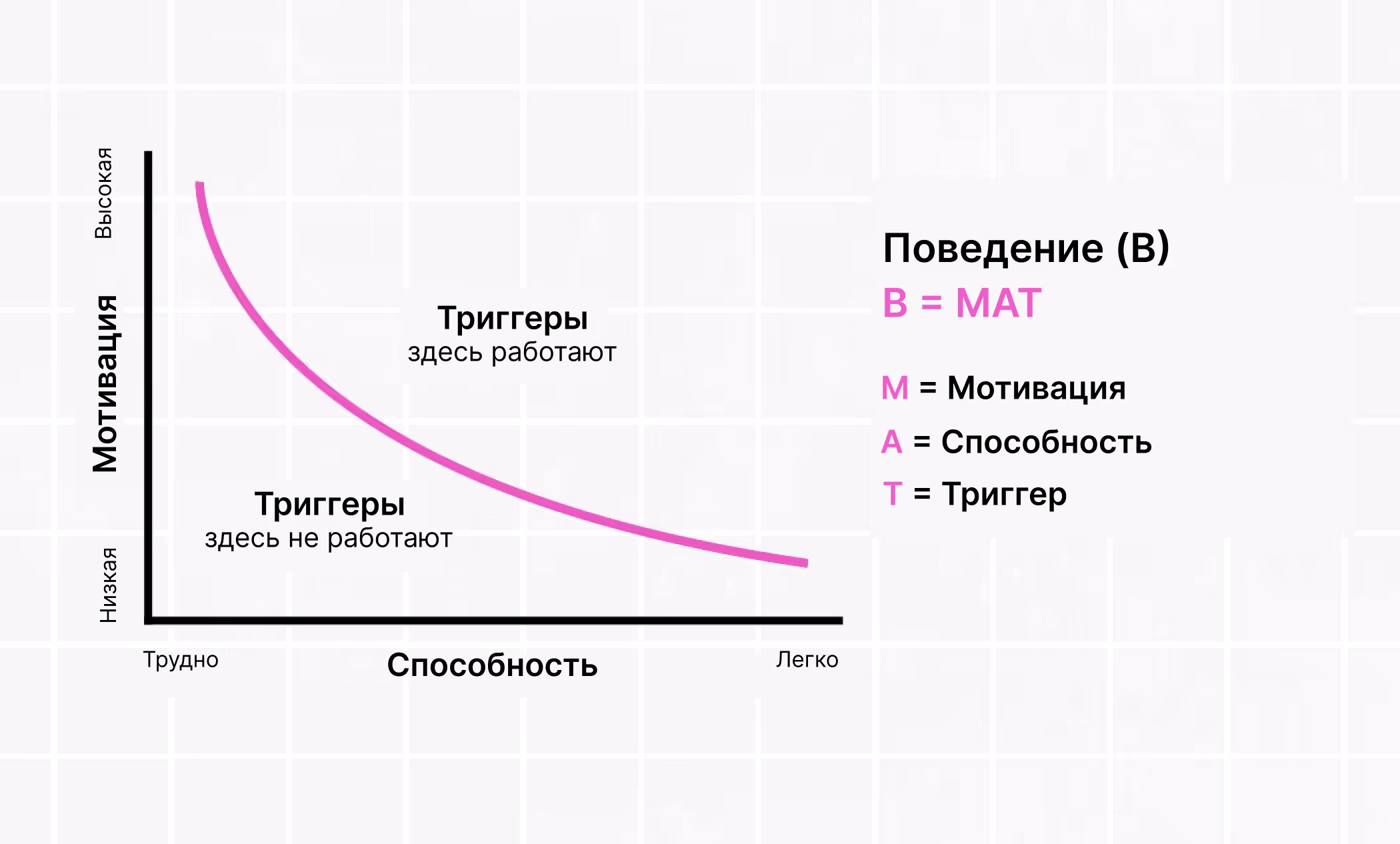 Таким образом, для совершения того или иного действия необходимо сочетание трех факторов — мотивации, способности и триггера. Чем сложнее задача, тем больше мотивации требуется пользователю