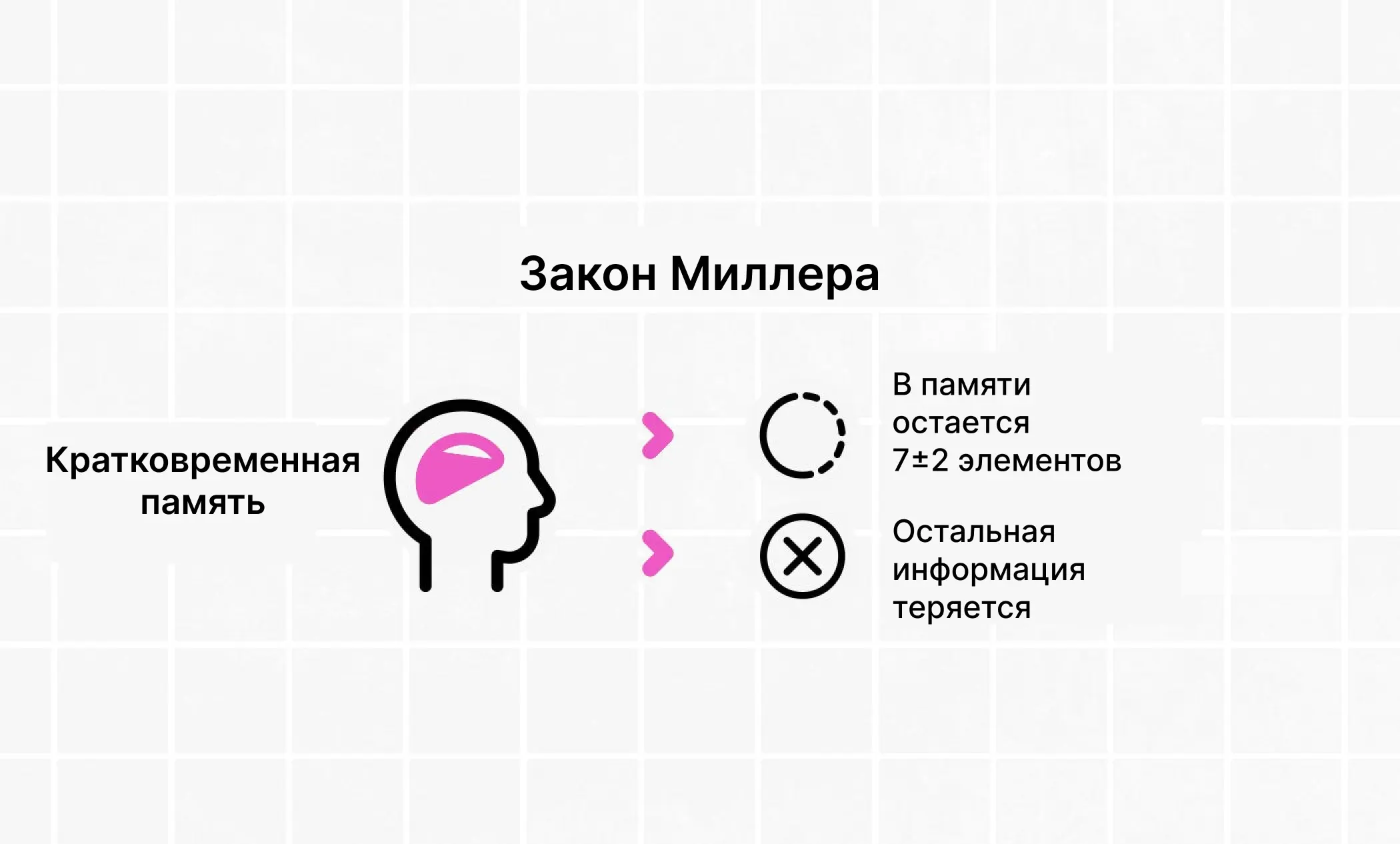 Наш мозг подобен рюкзаку 🎒— он может вместить ограниченный объем данных. Согласно закону Миллера мы способны удержать в нашей краткосрочной памяти в среднем 7±2 элементов. И это правило играет огромную роль в дизайне интерфейсов.
