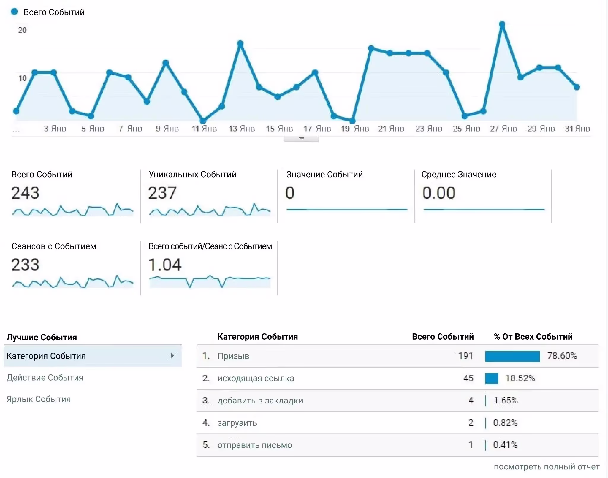 Отслеживание событий — еще один замечательный инструмент Google Analytics. Он позволяет увидеть действия, которые могут остаться незамеченными. С помощью отслеживания событий видны клики на кнопки с призывом к действию (прим. CTA, call to action), ссылки, действия с навигацией и остальными интерактивными элементами. Другими словами, можно понять, взаимодействуют ли люди с определенным интерактивным элементом на вашем сайте или нет.