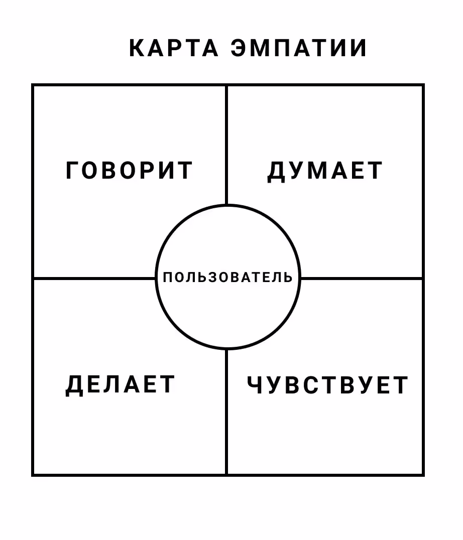 Карта эмпатии — это совместная (командная) визуализация, используемая для того, чтобы четко сформулировать сведения, известные нам об определенном типе пользователей.