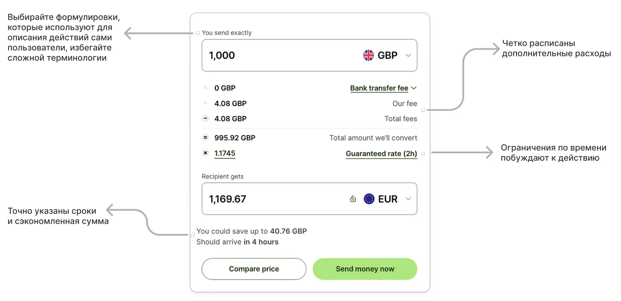 Чтобы ответить на этот вопрос, давайте рассмотрим интерфейс Wise, сервиса для международных денежных переводов. Когда человек попадает на сайт компании, он проходит через несколько этапов: