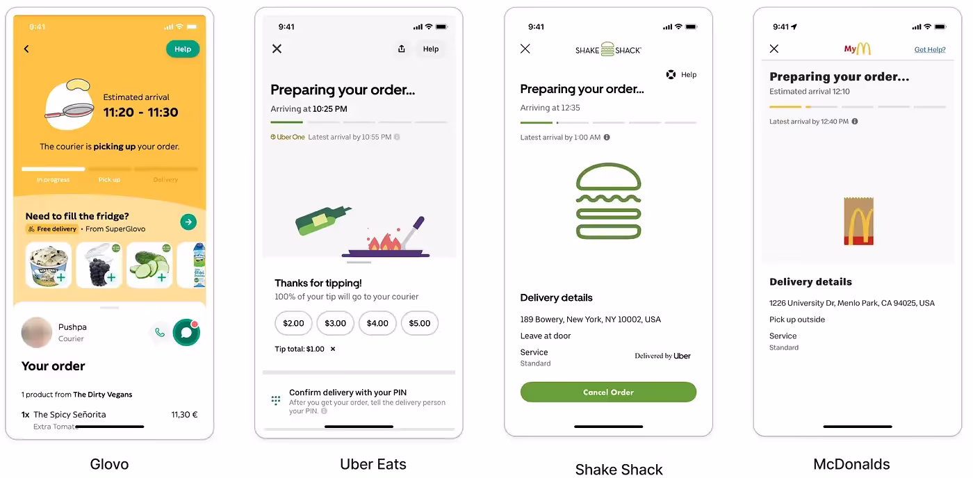 Другой пример — приложения для доставки еды, которые разбивают процесс на этапы и постепенно обновляют статус вашего заказа (Мы ищем подходящего водителя, Ваш водитель уже в пути, Ваша еда готовится), а в некоторых случаях даже добавляют анимацию готовящейся еды! Технически, некоторые из этих шагов выполняются быстрее, чем это преподносится.