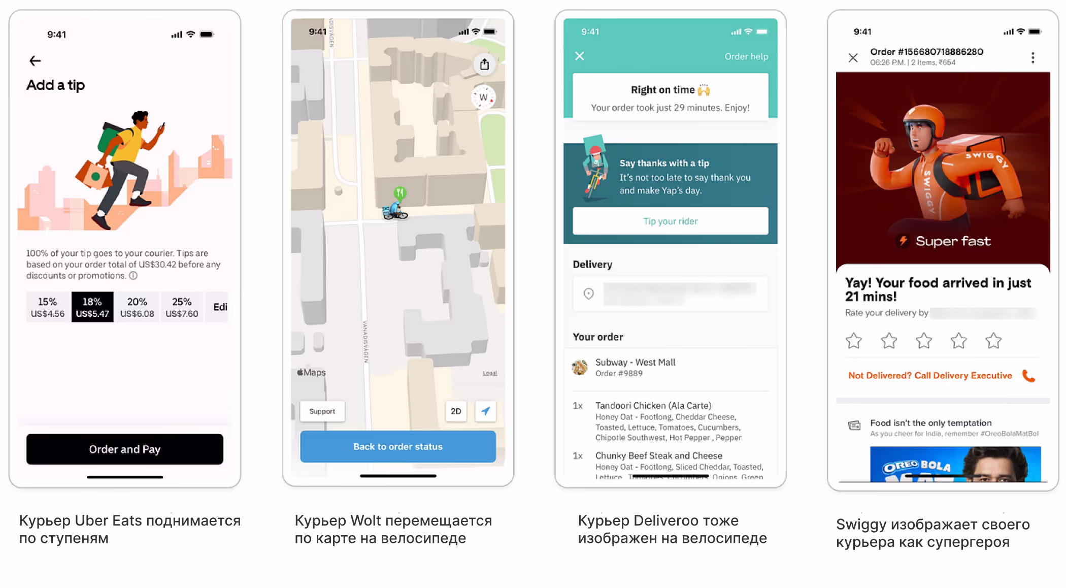 Цель этого подхода не в том, чтобы заставить вас ощутить вину — ведь курьер торопится к вам на велосипеде, пока вы едите макароны в постели. Он позволяет пользователям почувствовать себя более информированными и вовлеченными в процесс, что в свою очередь делает их снисходительнее и повышает удовлетворенность сервисом.