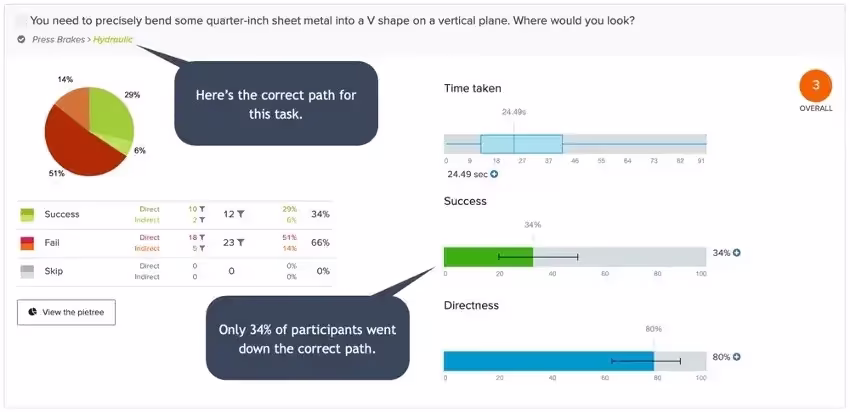 В первом древовидном тесте с исходной информационной архитектурой общая оценка составила 4,0 из 10 по восьми задачам. Во втором древовидном тесте с пересмотренной информационной архитектурой общая оценка по тем же восьми задачам составила 7,4 из 10, что на 85% повысило простоту нахождения продукта.