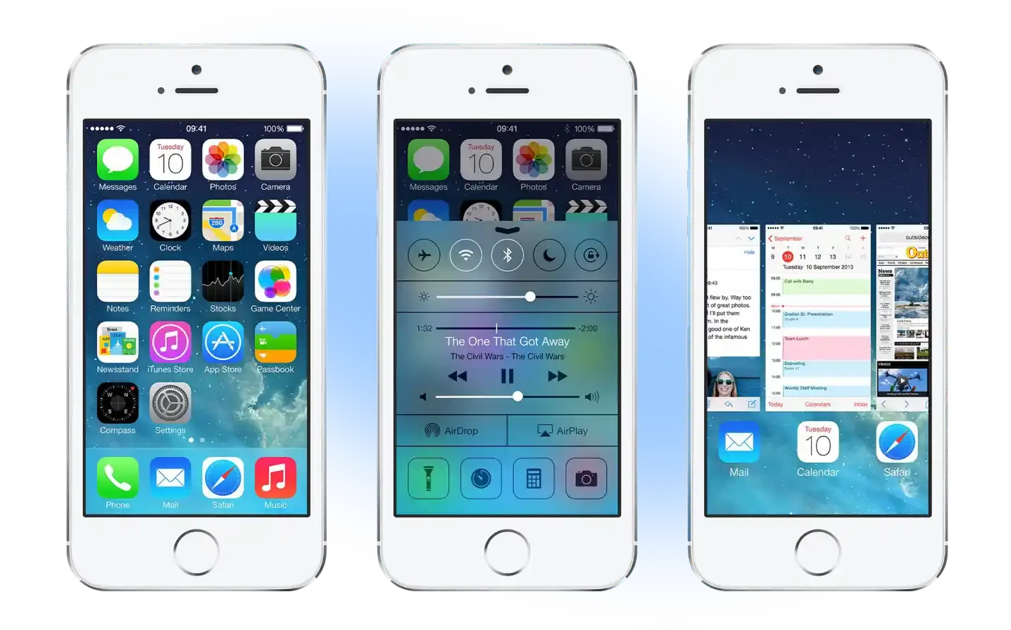 iOS 7 ознаменовала первый крупный эстетический сдвиг, представив миру плоский дизайн. Исчезли текстуры кожи в приложении «Найти друзей» и насыщенные тени в приложении калькулятора. Остался чистый, минималистичный интерфейс, ориентированный на ясность, читаемость и легкость. В новом «Пункте управления» реалистичные переключатели уступили место простым круглым кнопкам, а приложение «Погода» лишилось детальных анимаций облаков в пользу чистой типографики и градиентных фонов.