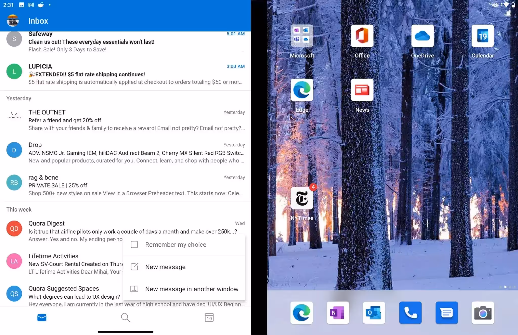 Если закрыть окно просмотра нового сообщения слева, это окно исчезнет, и у пользователя останется одноэкранное приложение. Однако для большинства пользователей переход между однооконным режимом и двухоконным режимом, вероятно, останется незамеченным, и они будут сбиты с толку, когда приложение внезапно решит использовать только один из двух экранов.