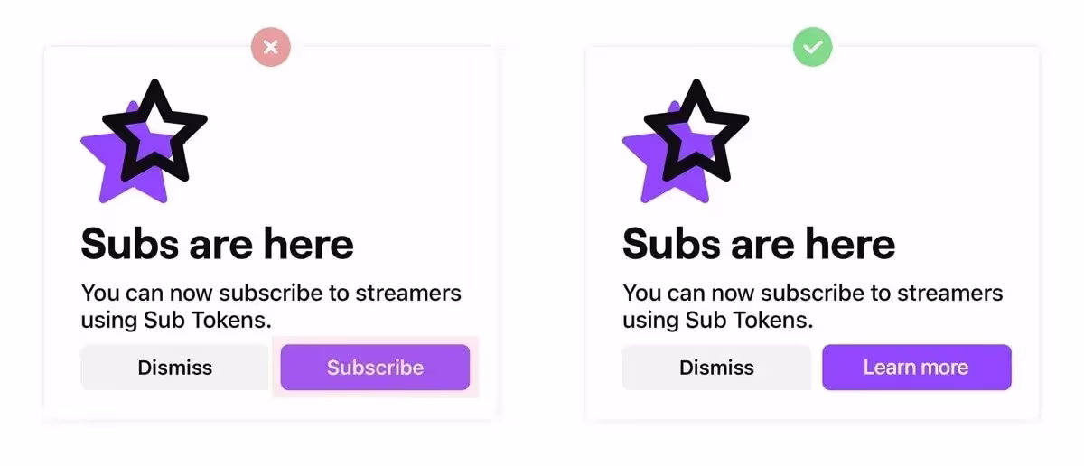 Модальное окно Twitch «Подписаться» - отличный пример того, чего не следует делать: они ничего не говорят вам о том, что на самом деле означает подписка, а затем заставляют вас принять решение.