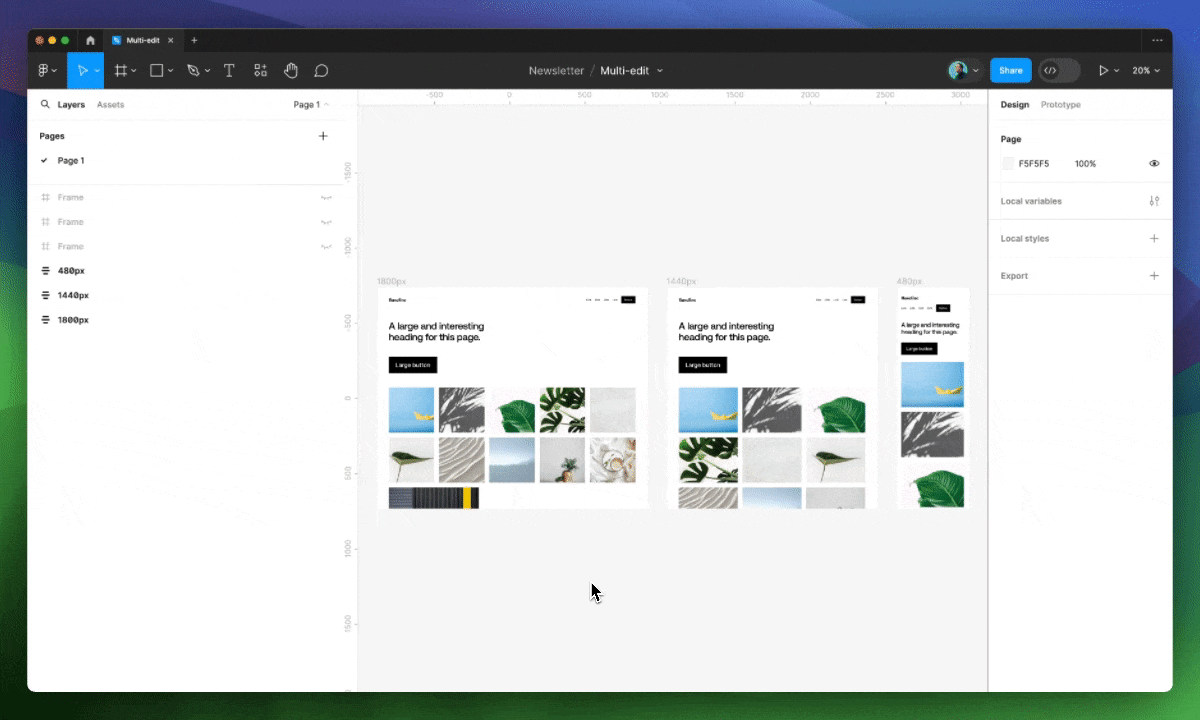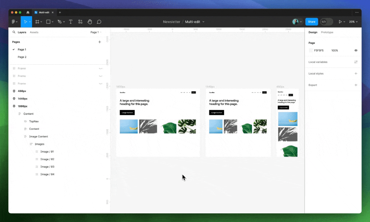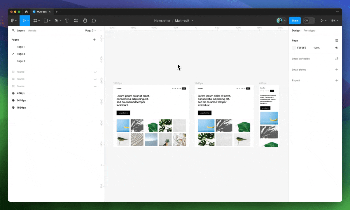 Представьте, что у вас в макетах имеется серия объектов, например изображений, и вы хотите упорядочить их с помощью Auto Layout. Мультиредактирование позволяет одним кликом или с помощью шортката Shift ⇧ + A применить эту функцию ко всем группам изображений внутри разных фреймов.
