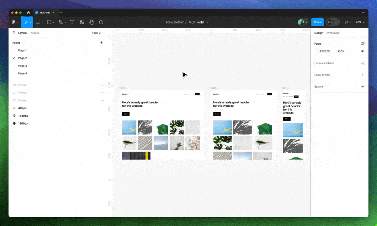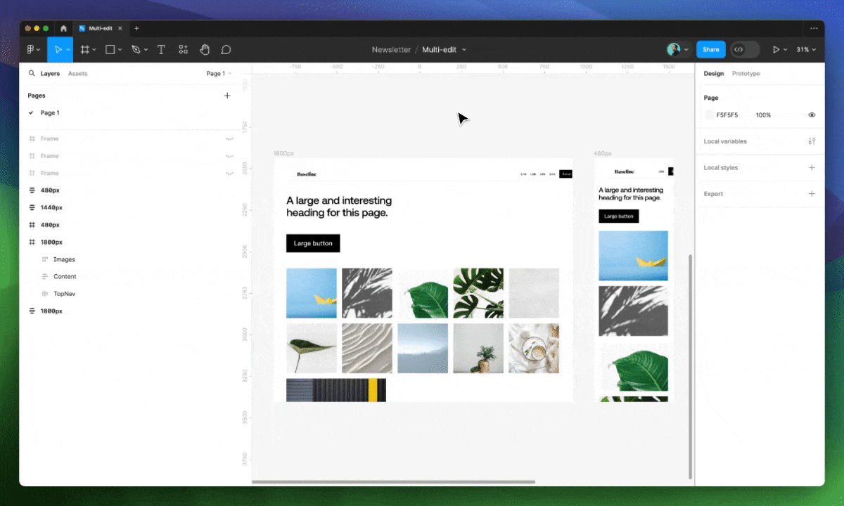 Иногда нам нужно просто поэкспериментировать и нарушить существующую структуру. С помощью мультиредактирования мы можем быстро перемещать выделенные объекты как в, так и из фреймов и групп, что раньше требовало большого количества кликов и перетаскиваний.