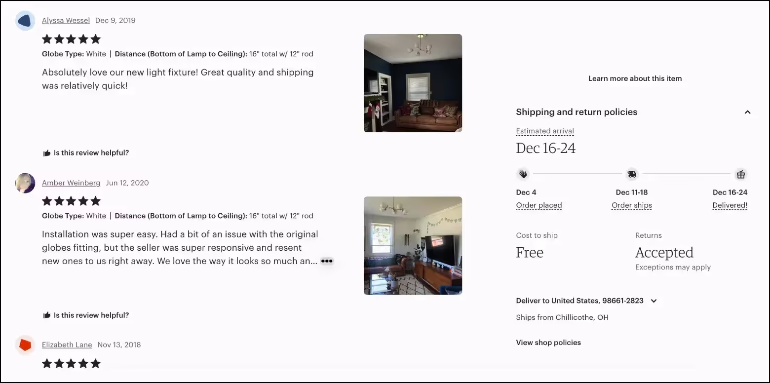 Также здесь разумно показать фотографии товара, но убедиться, что все его характеристики соответствуют выбору покупателя (цвет, размер, отделка и т.д.).