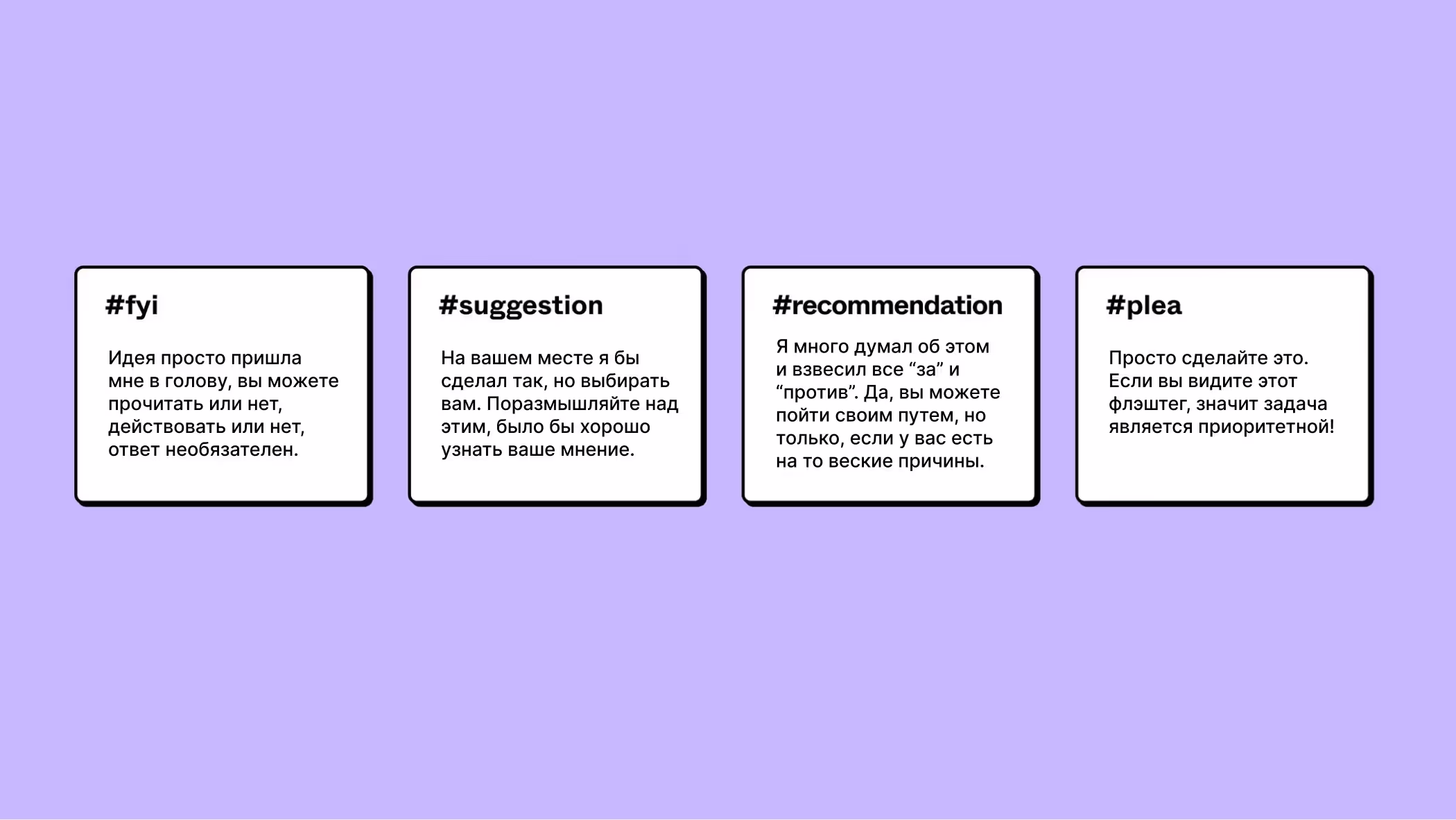 - #fyi (для вашего сведения) — идея просто пришла мне в голову. Вы можете прочитать или нет, действовать или нет, ответ необязателен.
