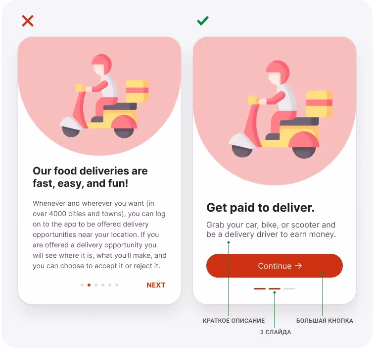 Один из главных недостатков слайдера состоит в том, что многие пользователи не могут запомнить прочитанное. Когда они заходят в приложение по окончании онбординга, им приходится вспоминать всю полученную информацию, чтобы эффективно использовать продукт.