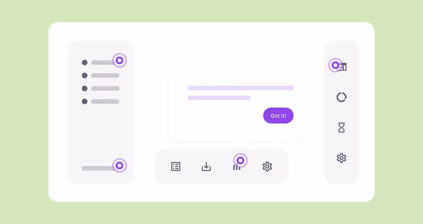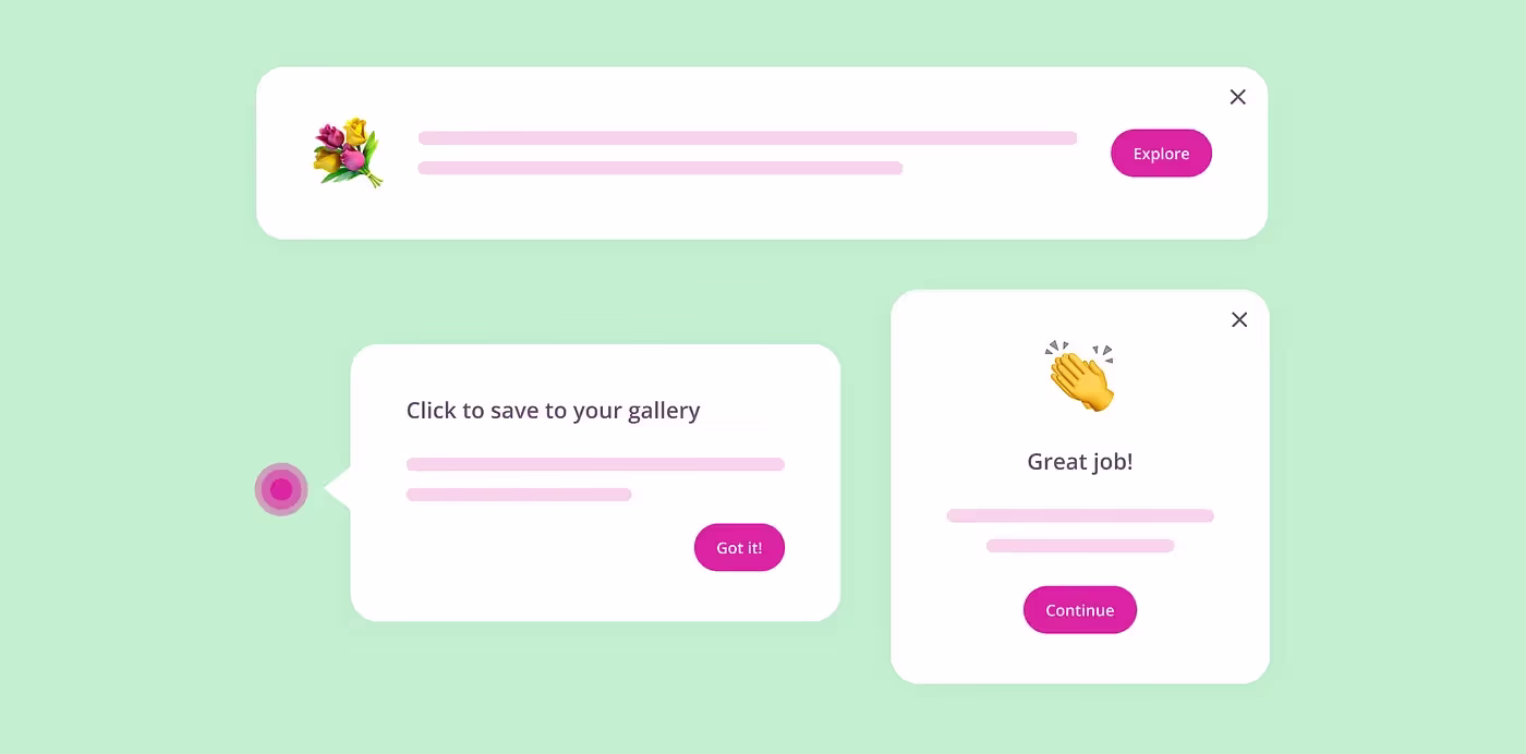Тур — это подсказки, которые шаг за шагом знакомят пользователей с ключевыми функциями и возможностями продукта. Чаще всего его основными элементами являются всплывающие подсказки, поп-апы или оверлеи. Их можно пролистывать вперед или назад, что позволяет пользователю изучать продукт в своем собственном темпе.
