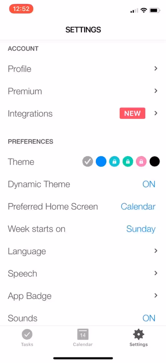 Приложение Any.do позволяло настроить визуальный дизайн в разделе «Настройки» и не предлагало пользователям выбрать цветовую схему при первом запуске.
