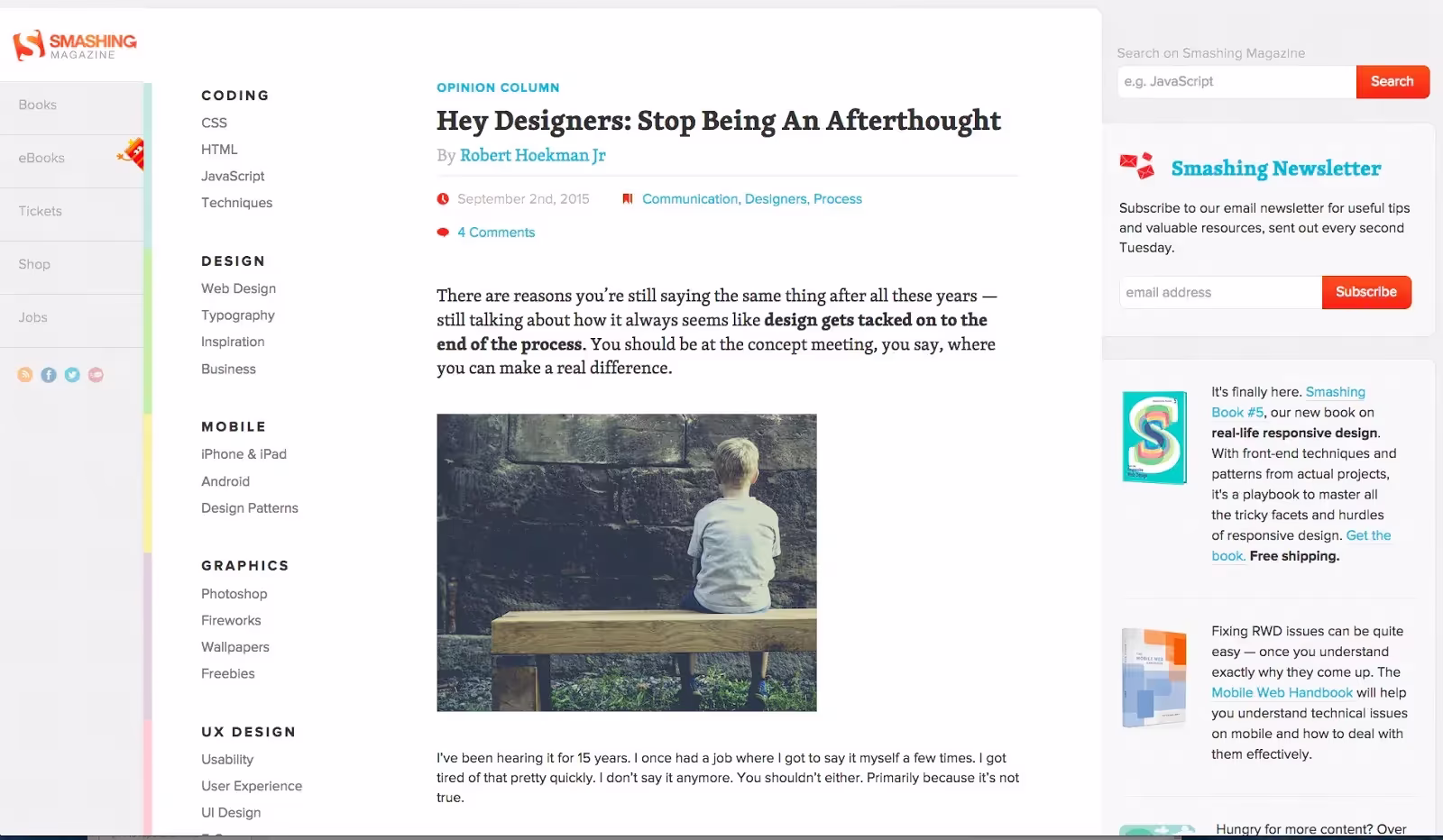 Контент остается прежним, но кнопка меню исчезает, и теперь мы видим все навигационные ссылки. Под ними появляются категории контента для быстрого доступа к соответствующим материалам. Справа размещается боковая панель с полем поиска, формой подписки на рассылку и рекламой продуктов Smashing Magazine, что делает дизайн более эффективным для достижения бизнес-целей.