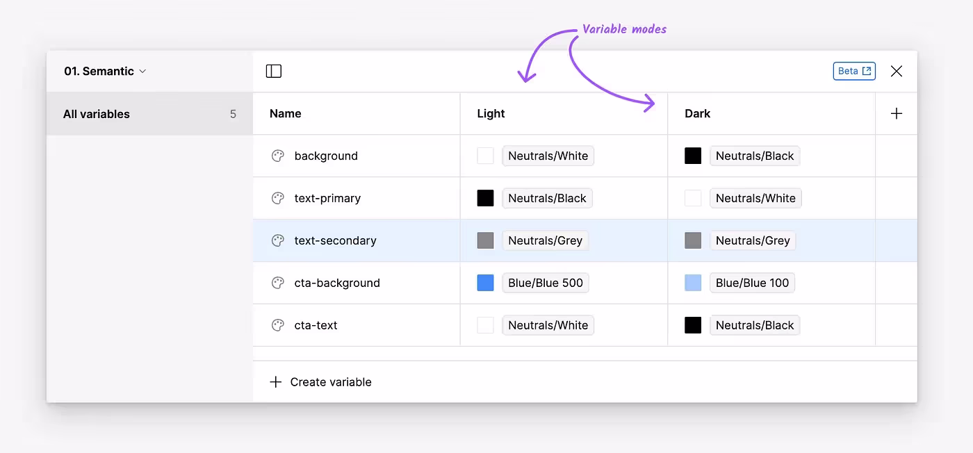 Режимы переменных позволяют определять альтернативные значения для разных состояний интерфейса. Самый практичный и популярный вариант использования — создание переменных для светлого и темного режимов. Альтернативный пример — определение отступов или ширины элементов для разных контрольных точек (десктоп, планшет, мобильные устройства).