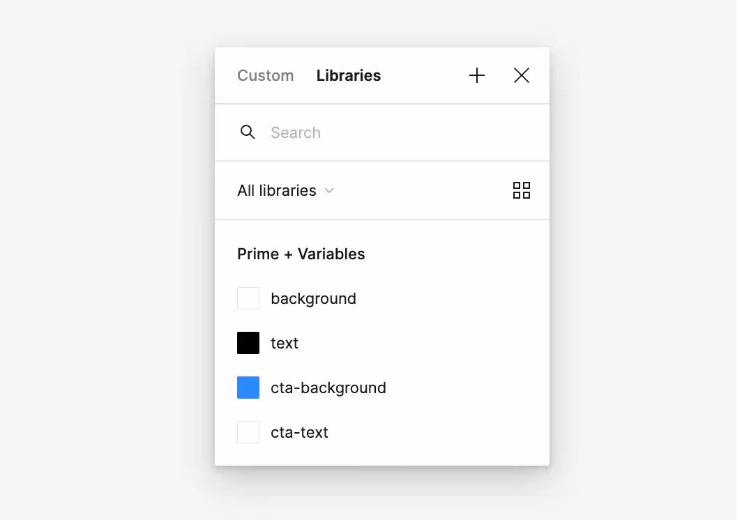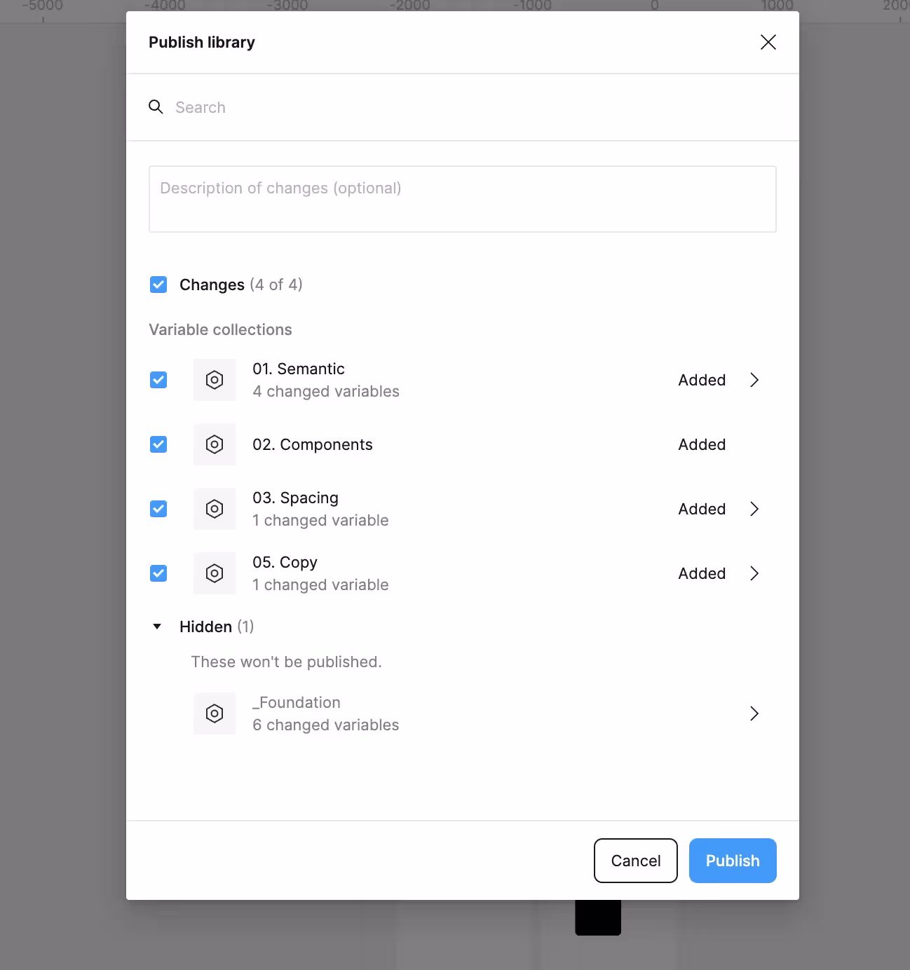 Как и в случае со стилями, вы можете опубликовать переменные в библиотеке, после чего они будут видны в разных документах. Это очень полезно при работе с более сложными дизайн-системами.