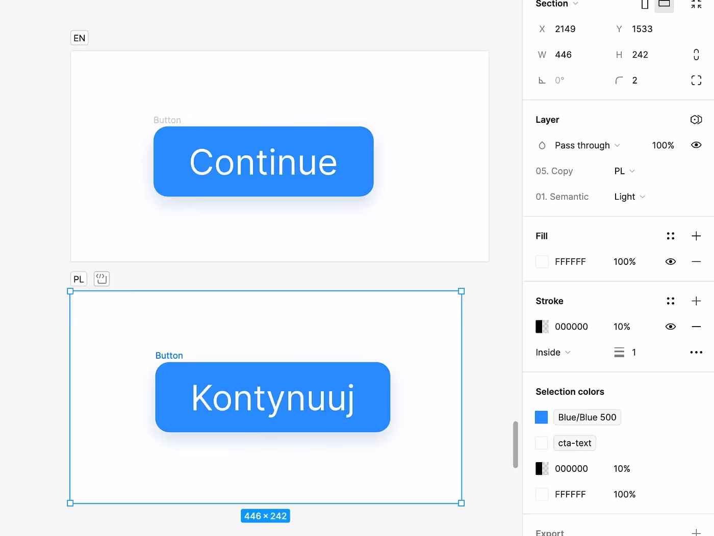 Как только вы поместите свои макеты в секцию, вы можете выбрать ее и настроить те Коллекции и Режимы, которые будут использоваться в этой области. Ту же технику можно применить ко всей странице. Это позволяет поместить мультиязычные макеты и темную/светлую темы на разные страницы документа Figma.