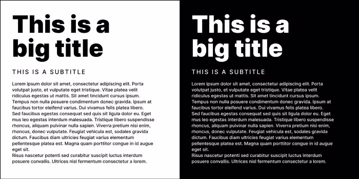 - В темном режиме шрифты будут выглядеть более жирными. Учитывайте это при работе с большими областями текста и крупными жирными заголовками. В ряде случаев рекомендуется уменьшить насыщенность шрифта в темном режиме, чтобы штрихи букв оставались оптически похожими на буквы, расположенные в светлой версии.