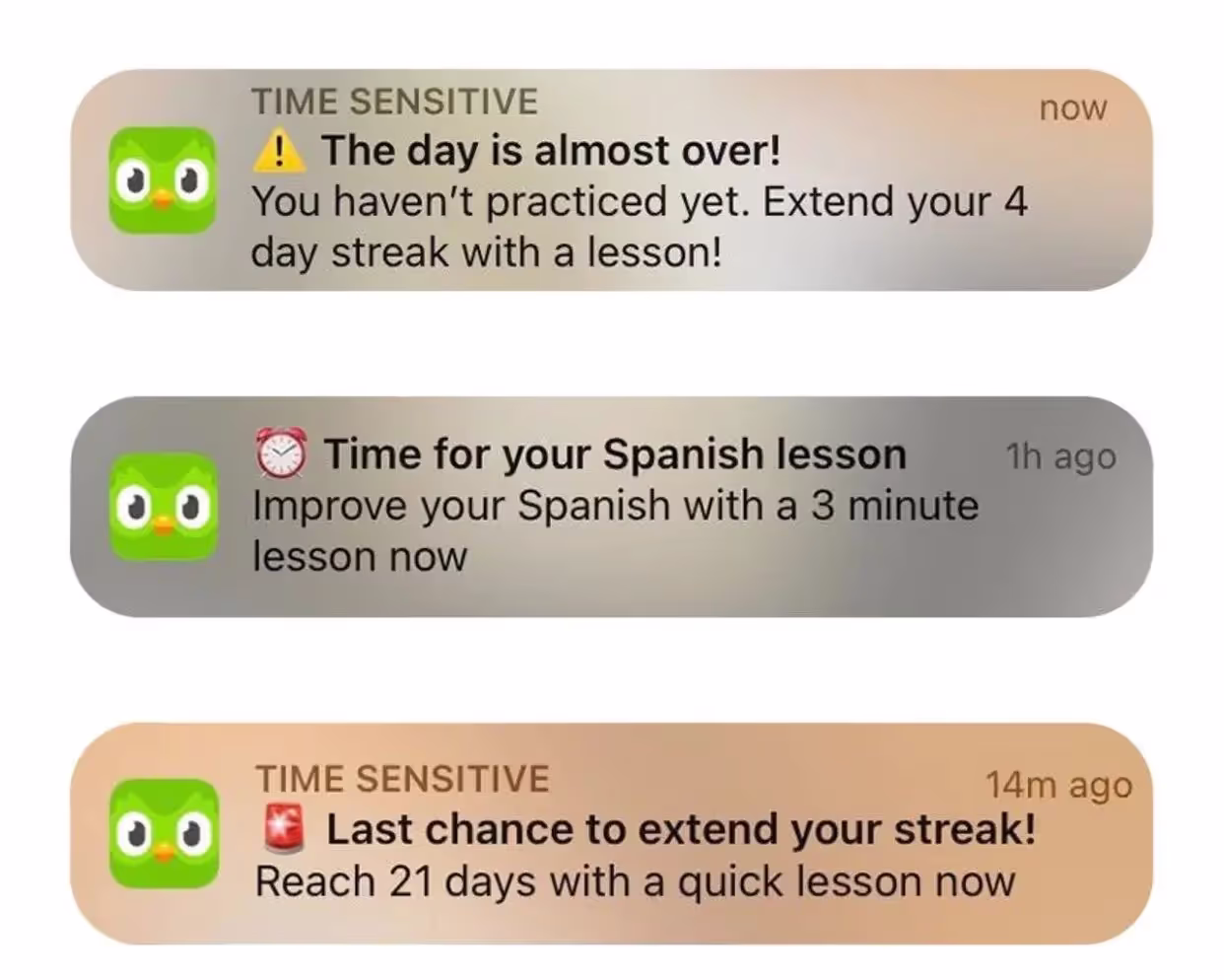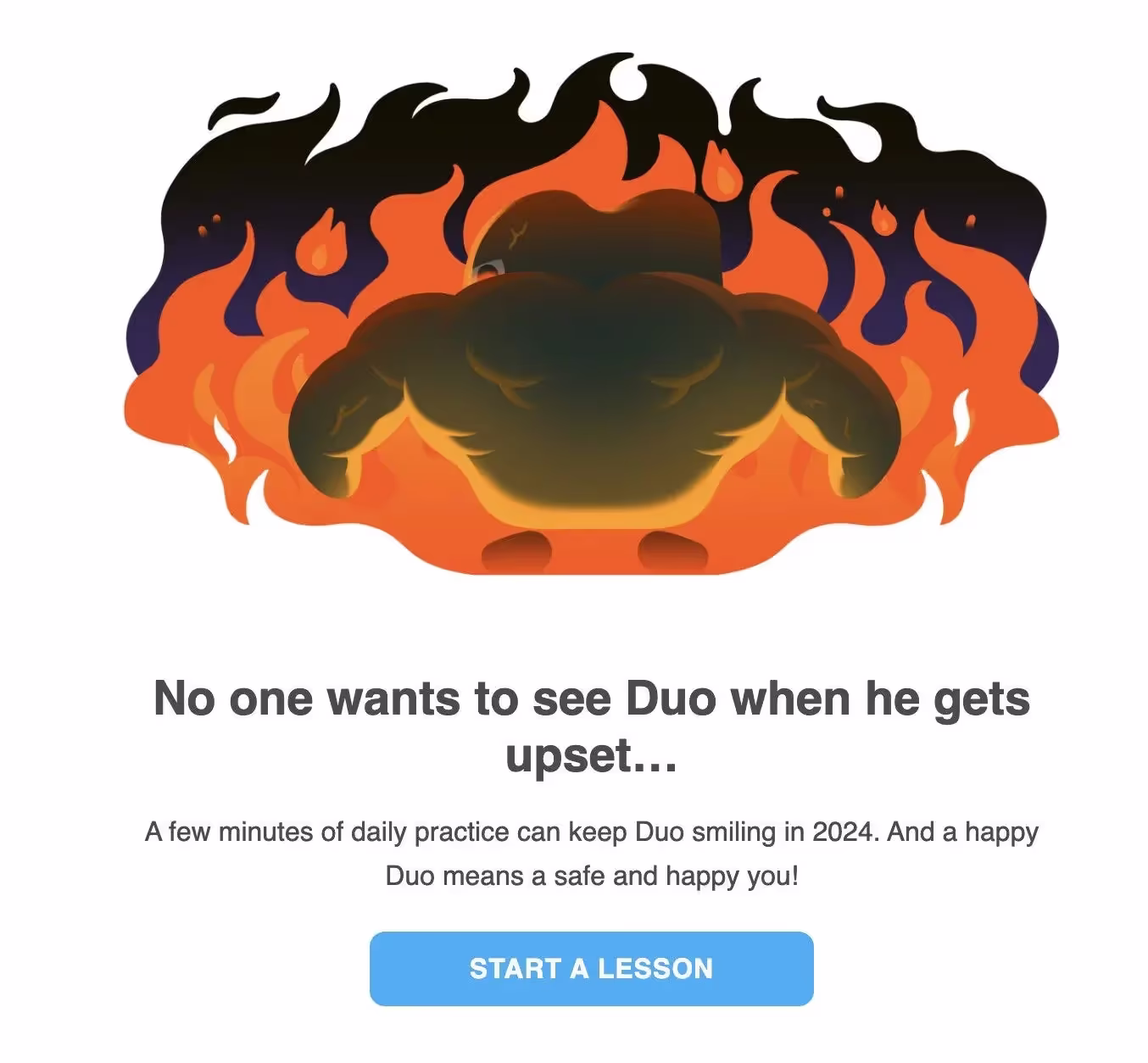 Приложение Duolingo (скандально) знаменито своими призывами к действию. Дуо будет умолять пользователей пройти очередной урок по электронной почте, в push-уведомлениях и внутри виджетов. Чем дольше люди игнорируют эти призывы, тем более интенсивными они становятся.