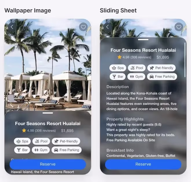 В примере вы можете увидеть разницу между обычным превью или изображением, которое касается краев экрана. Отель на фотографии справа выглядит более завораживающим, чем на превью слева. В то же время такое расположение не оказывает негативного влияния на остальной контент, а кнопки по-прежнему работают.