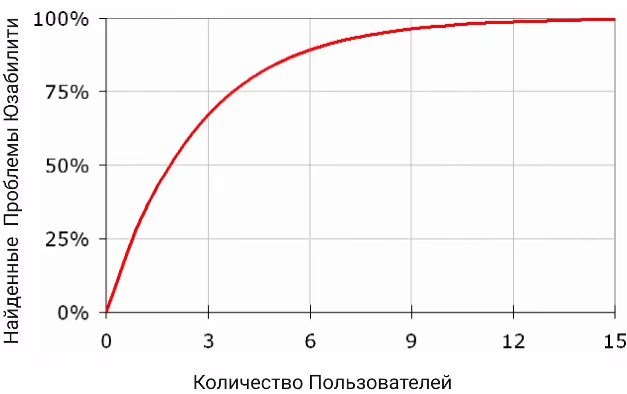 Кривая ясно показывает, что вам нужно протестировать как минимум 15 пользователей, чтобы выявить все проблемы юзабилити в дизайне. Так почему я рекомендую тестировать гораздо меньшее количество пользователей?