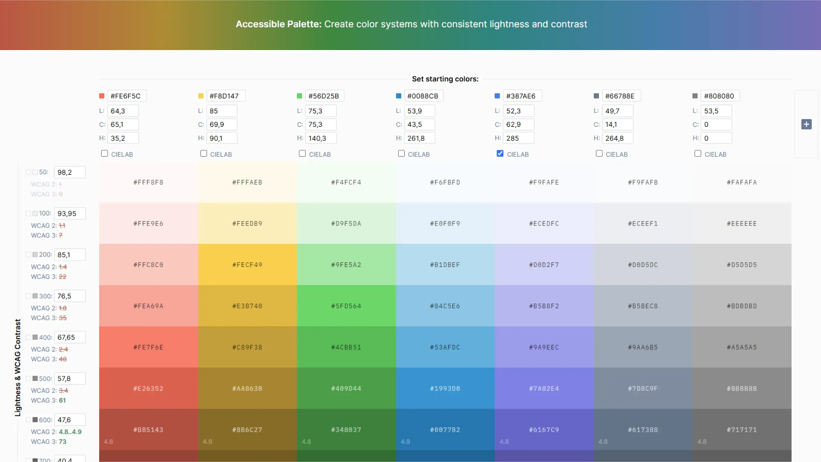 — Accessible Palette — сервис для создания цветовых систем с предсказуемыми уровнями контраста.
