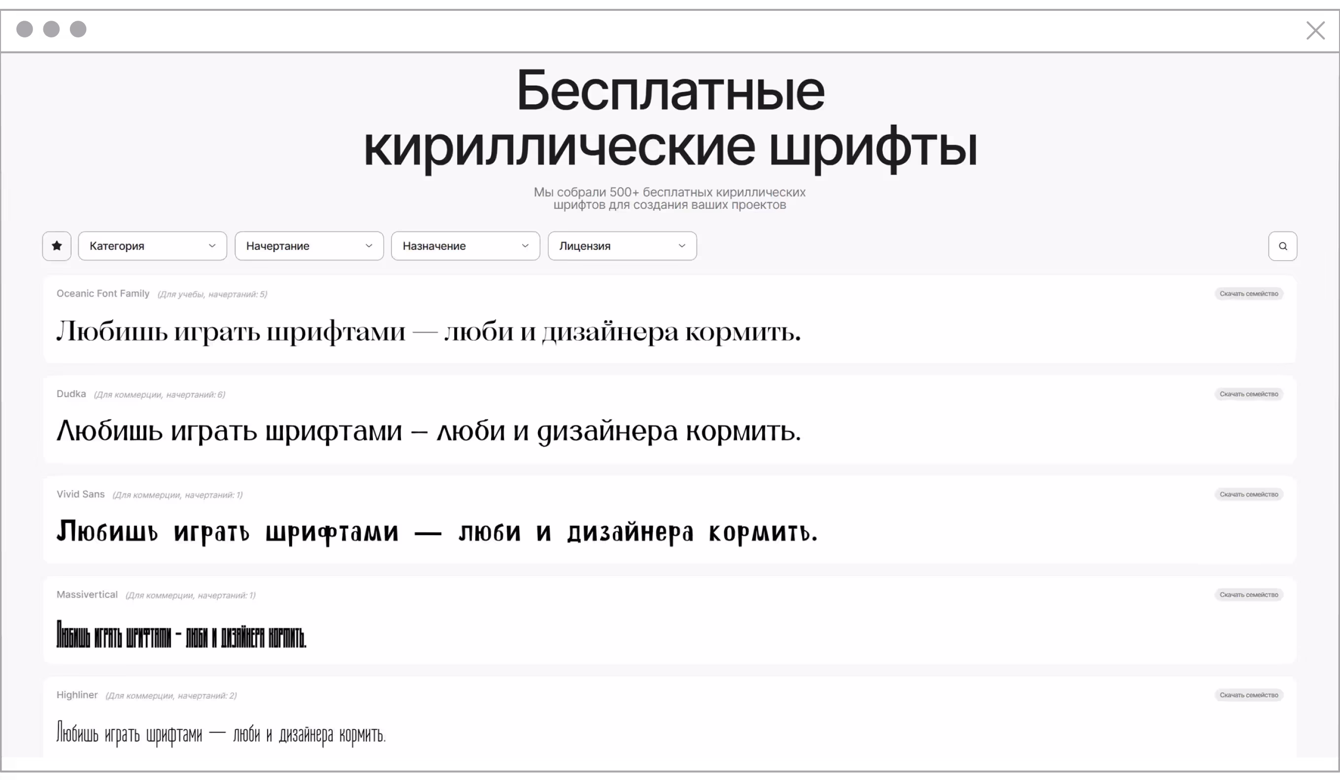 Полезный ресурс для UX/UI-дизайнеров, которые ищут качественные бесплатные шрифты и альтернативы премиальным гарнитурам. Помимо удобного поиска по категориям (Sans, Serif, Script и др.), сервис предлагает детальные описания каждого шрифта: поддерживаемые языки, лицензия, стилистические особенности. А перед скачиванием можно протестировать шрифт прямо на сайте, введя любое слово.