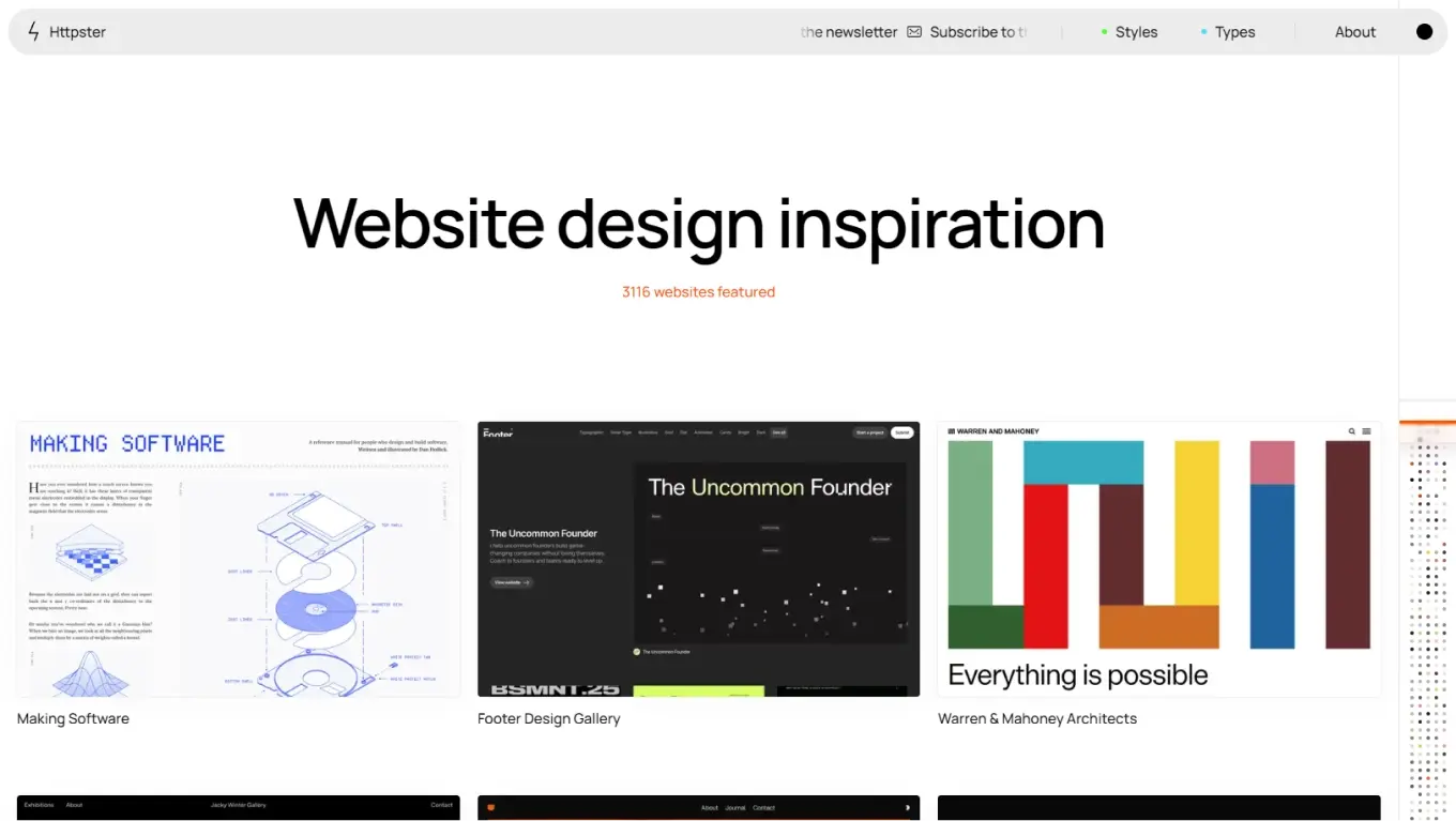 Сайт особенно удобен для быстрого поиска по стилям (брутализм, минимализм, темные или иллюстративные сайты и др.) и типам проектов (от музыкальных витрин до лендингов образовательных платформ). Httpster не про тренды, а про характер и смелость, которые важны при создании уникального визуального языка интерфейса. Вы можете подписаться на еженедельную рассылку, чтобы отслеживать самые свежие проекты.