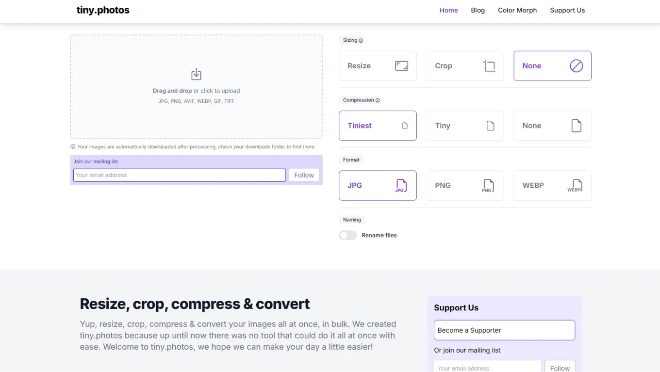 tiny.photos имеет простой и понятный нтерфейс, операции выполняются мгновенно, и, самое главное, сервис бесплатен: без ограничений на количество и размер файлов.