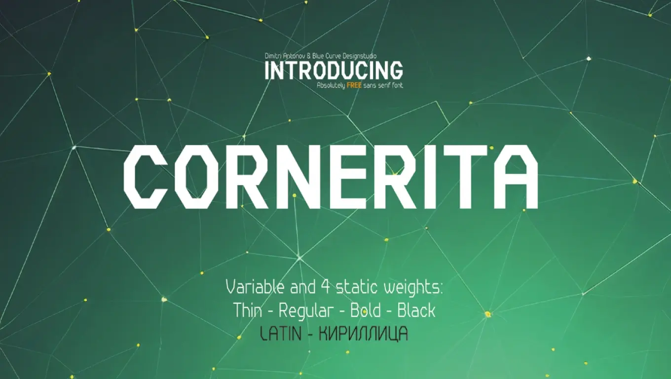 Шрифт отлично работает в логотипах, спортивной айдентике, плакатах, принтах на одежде и журнальных заголовках. Его выразительные очертания особенно хорошо проявляются в крупных кеглях и лаконичных композициях. Автор шрифта — Dimitri Antonov, открыл Cornerita для свободного использования как в личных, так и в коммерческих проектах.