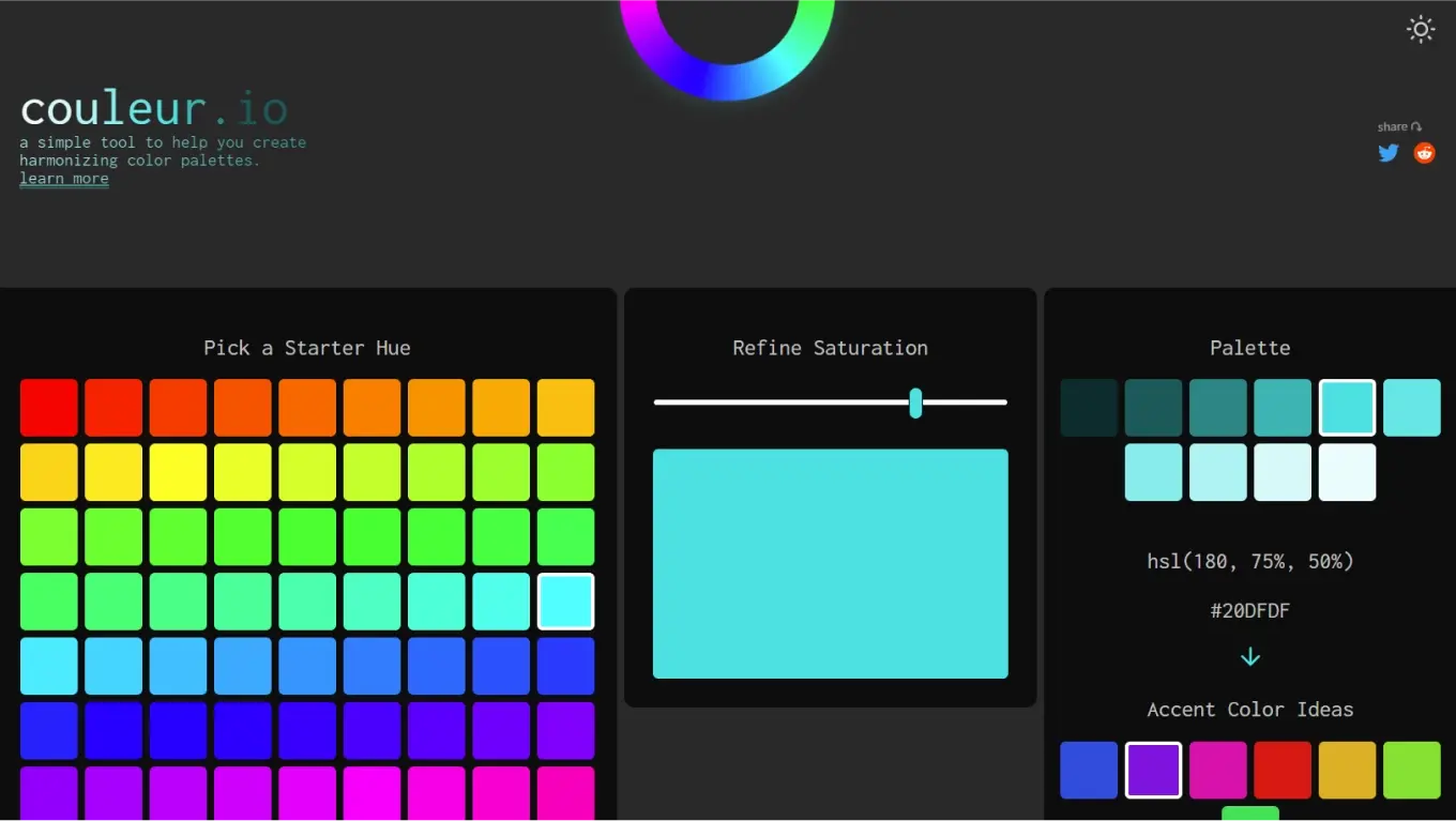 Минималистичный, но мощный инструмент для генерации гармоничных цветовых палитр на основе HSL-модели. Основа палитры строится на одном выбранном оттенке и уровне насыщенности, а затем расширяется через варьирование яркости — таким образом вы получаете 10 согласованных цветов для интерфейса или сайта. Инструмент также предлагает генерацию акцентных цветов, что позволяет подобрать контрастные оттенки, не нарушая визуальную гармонию.
