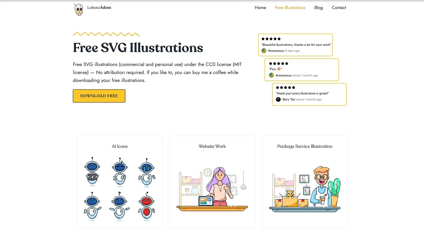 Это онлайн-библиотека, созданная польским дизайнером Лукашем Адамом, с более чем 250 уникальными SVG-иллюстрациями, доступными бесплатно даже для коммерческих проектов. Изображения идеально подходят для: landing page, корпоративных сайтов, презентаций, соцсетей, полиграфии, интерфейсов.