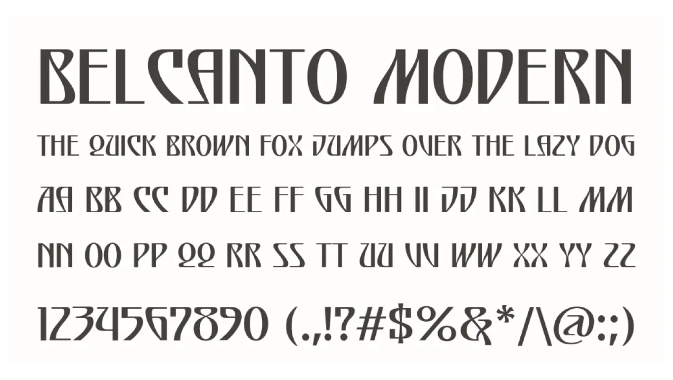 Декоративный шрифт в стиле модерн, который сочетает в себе плакатную выразительность и утонченность начала XX века. Его формы вдохновлены историческим модерном, но при этом они смотрятся актуально и современно. Легкая асимметрия и художественные акценты делают каждую букву не просто знаком, а элементом графической композиции. Belcanto Modern отлично работает в афишах, презентациях и баннерах, где нужно сразу привлечь внимание и задать атмосферу стиля.