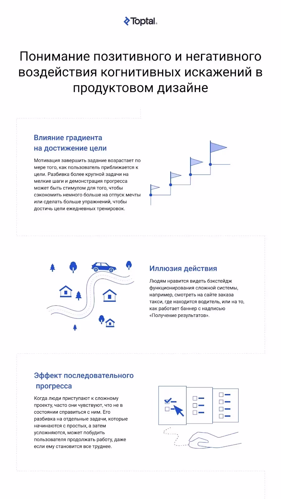 Ниже представлена инфографика. Она иллюстрирует некоторые из основных когнитивных искажений, которые влияют на поведение людей в интернете. Их применение поможет дизайнерам создавать более интуитивно понятные продукты, которые наилучшим образом будут отвечать потребностям пользователей.