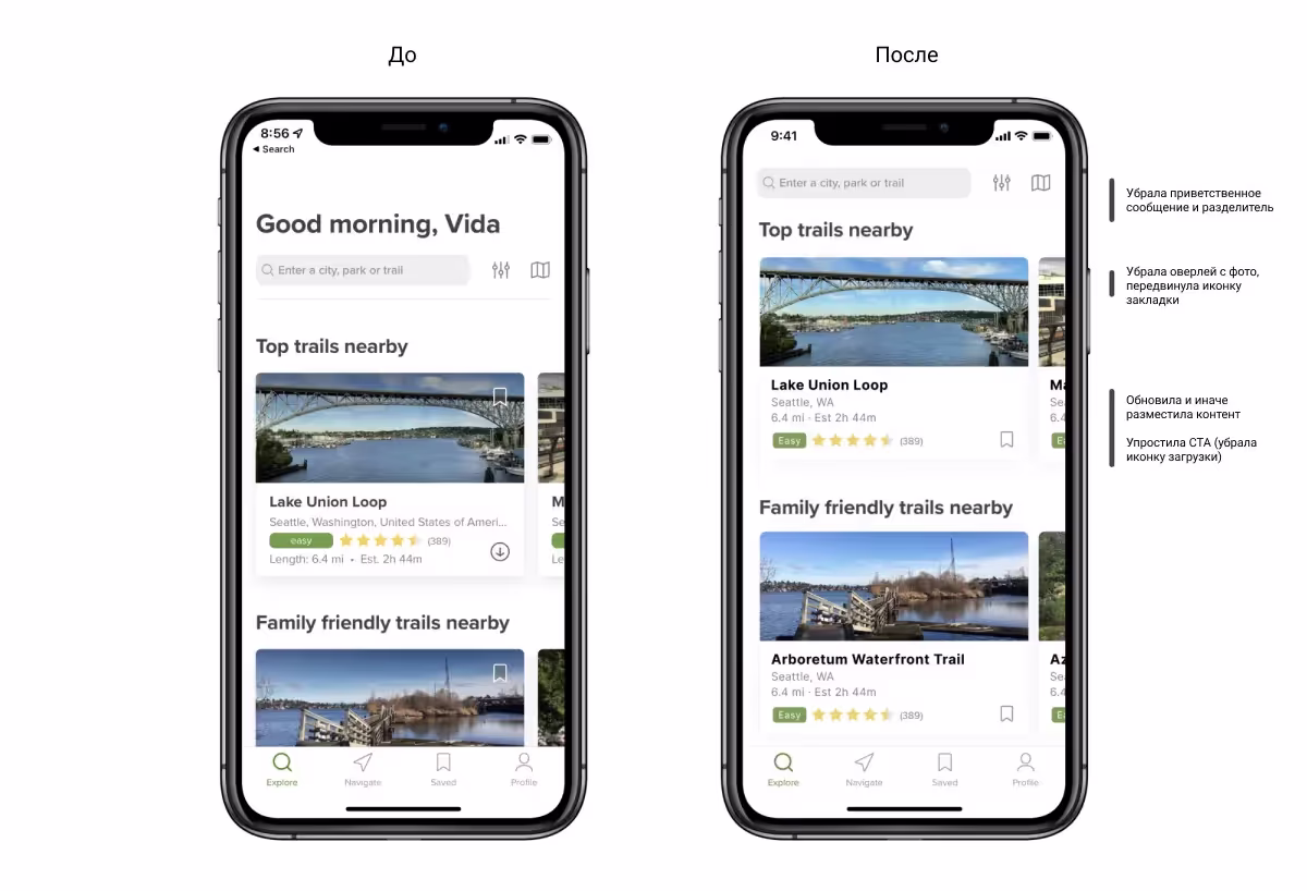 - Плашка с уровнем сложности маршрута и рейтинг разрывают текстовый контент, что нарушает визуальный баланс. По возможности группируйте визуальные элементы вместе.