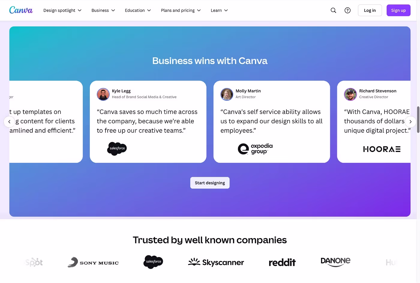 На главной странице и странице с ценами Canva отображаются отзывы руководителей компаний, в которых они рассказывают о том, как инструмент упростил их работу. Ниже размещены логотипы известных брендов, которые используют Canva, что создает ощущение надежности и вызывает доверие.