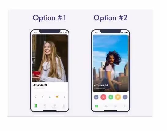 Как только клиент утверждает вайрфреймы, команда начинает работу над визуальным стилем приложения. Дизайнеры создают визуальный стиль продукта, учитывая требования бизнеса и особенности целевой аудитории. Команда разрабатывает две или три визуальные концепции проекта, из которых клиент выбирает одну. На изображении ниже показаны две дизайн-концепции, созданные для Greenlight — мобильного приложения для знакомств.