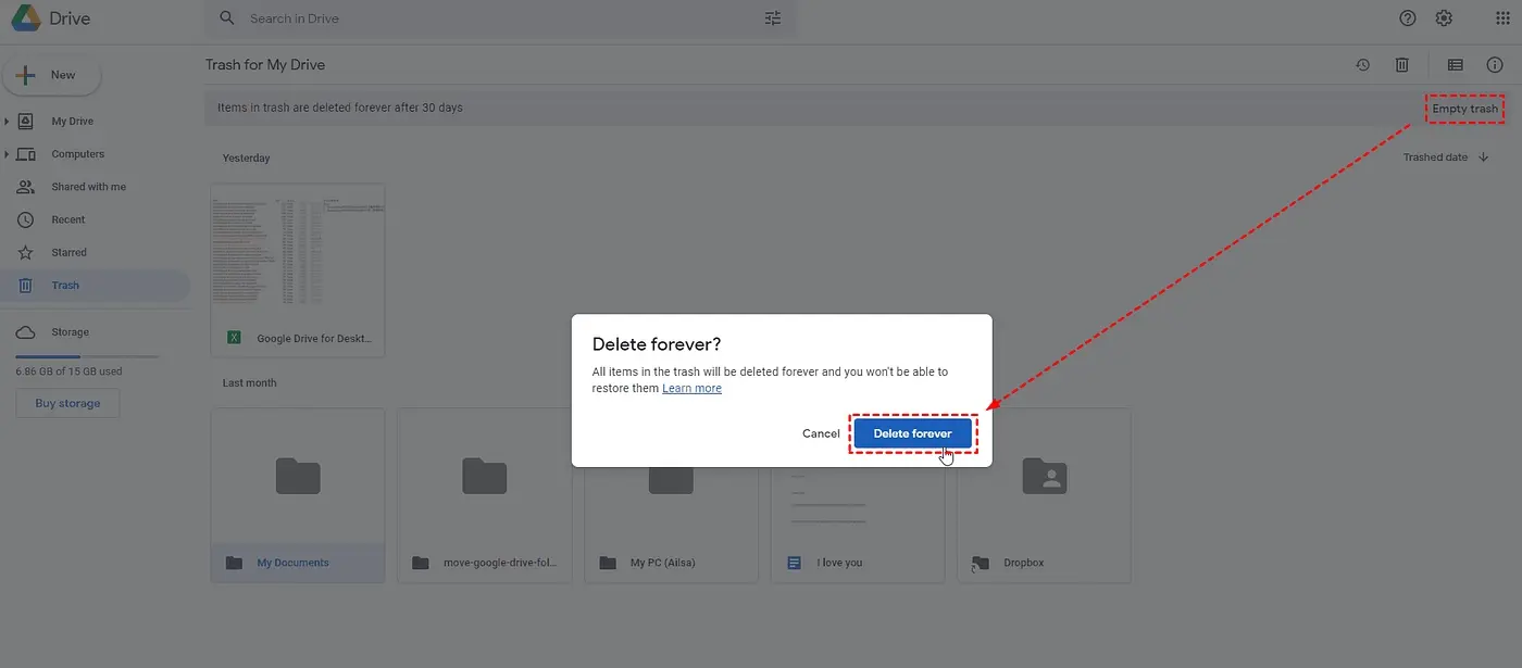 В модальном окне написано: «Удалить навсегда? Все элементы в корзине будут удалены навсегда, и вы не сможете их восстановить».