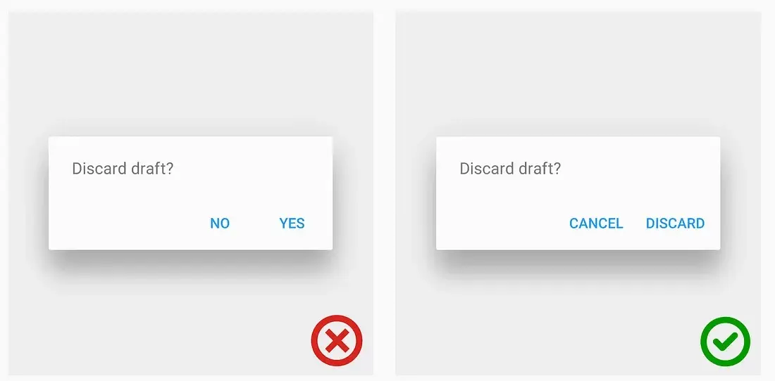 Избегайте расплывчатых формулировок, таких как «ОК» или «Да/Нет», которые не отражают, с чем именно соглашается или от чего отказывается пользователь.