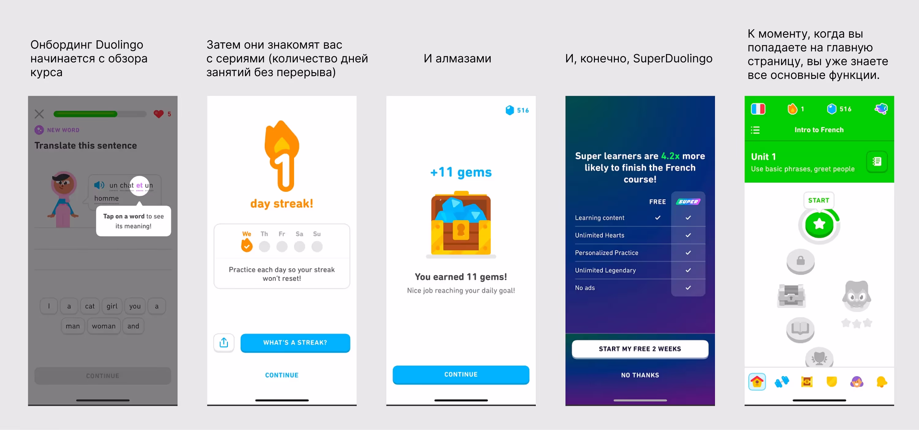 Хороший пример — Duolingo, популярное приложение для изучения языков. С его помощью вы можете практиковать произношение, учить грамматику, накапливать баллы, получать значки и т.д. Функций множество, но вы знакомитесь с ними постепенно.